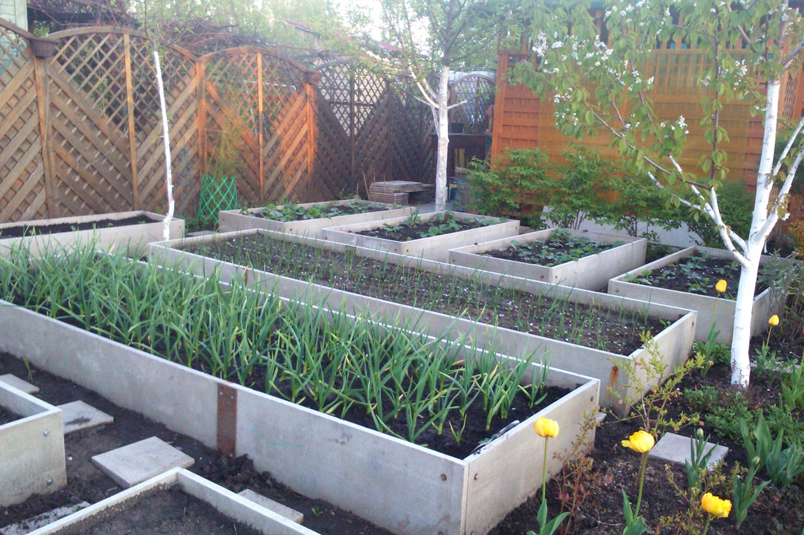 Чтобы создать грядки с первого фото, понадобится миксер и старая ванна или бетономешалка, пара горок песка и щебня, а еще для опалубки понадобится столько досок, что уже из них можно сделать все грядки, описанные выше.