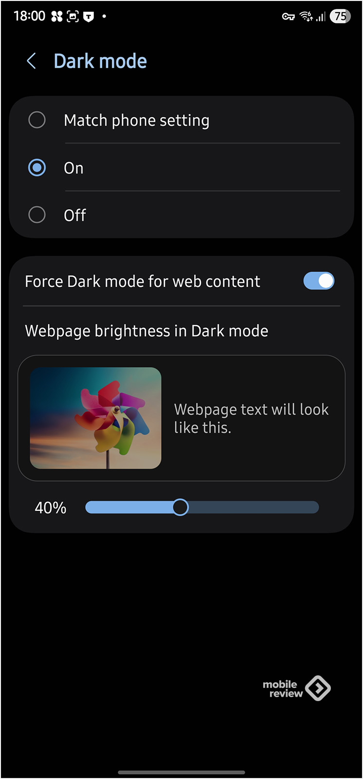 В Samsung Internet при включении тёмного режима темнеет весь сайт, включая фон. При этом есть настройки: можно скорректировать цвет текста, чтобы ослепительно белые буквы на чёрном фоне не раздражали глаза.