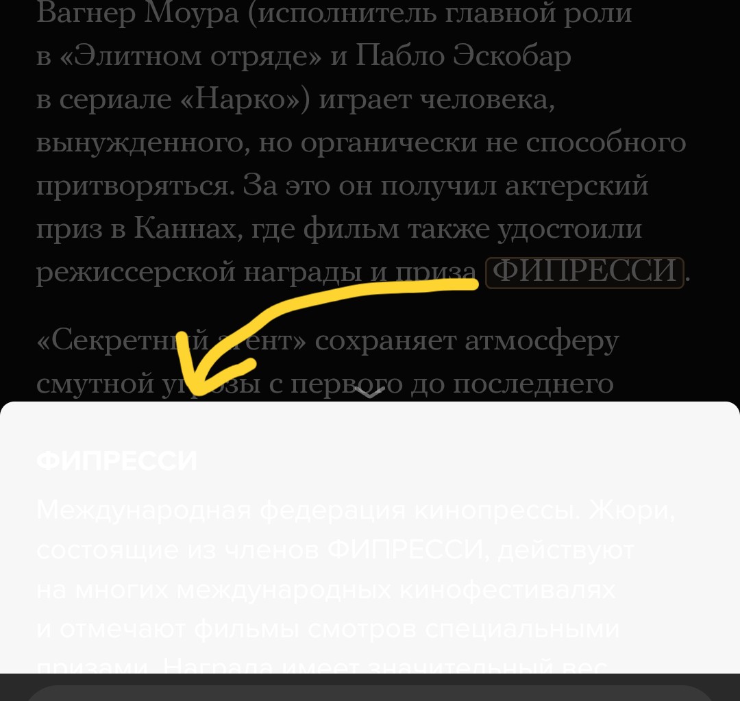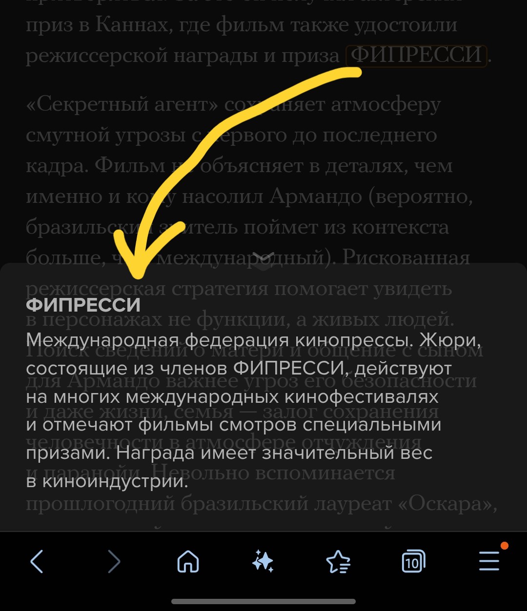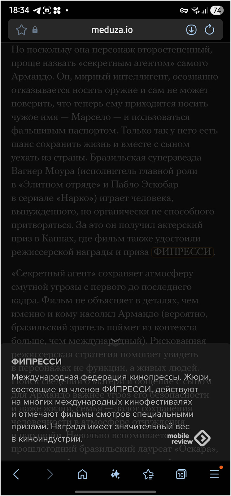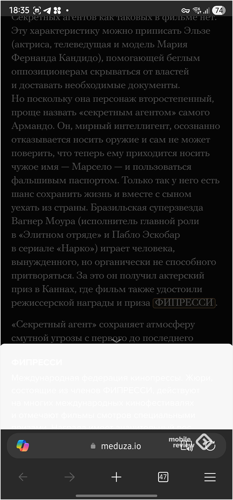 Формально тёмный режим «на всю страницу» считается экспериментальным, поскольку иногда сайты могут отображаться некорректно. С Samsung Internet я с таким не сталкивался, а в Microsoft Edge — регулярно. Пример: на странице с описанием фильма упоминается «ФИПРЕССИ». Нажимаешь — всплывает подсказка с объяснением, что это такое. В Samsung Internet всё корректно, а в Microsoft Edge фон подсказки остаётся светлым, шрифт становится белым — прочитать невозможно.