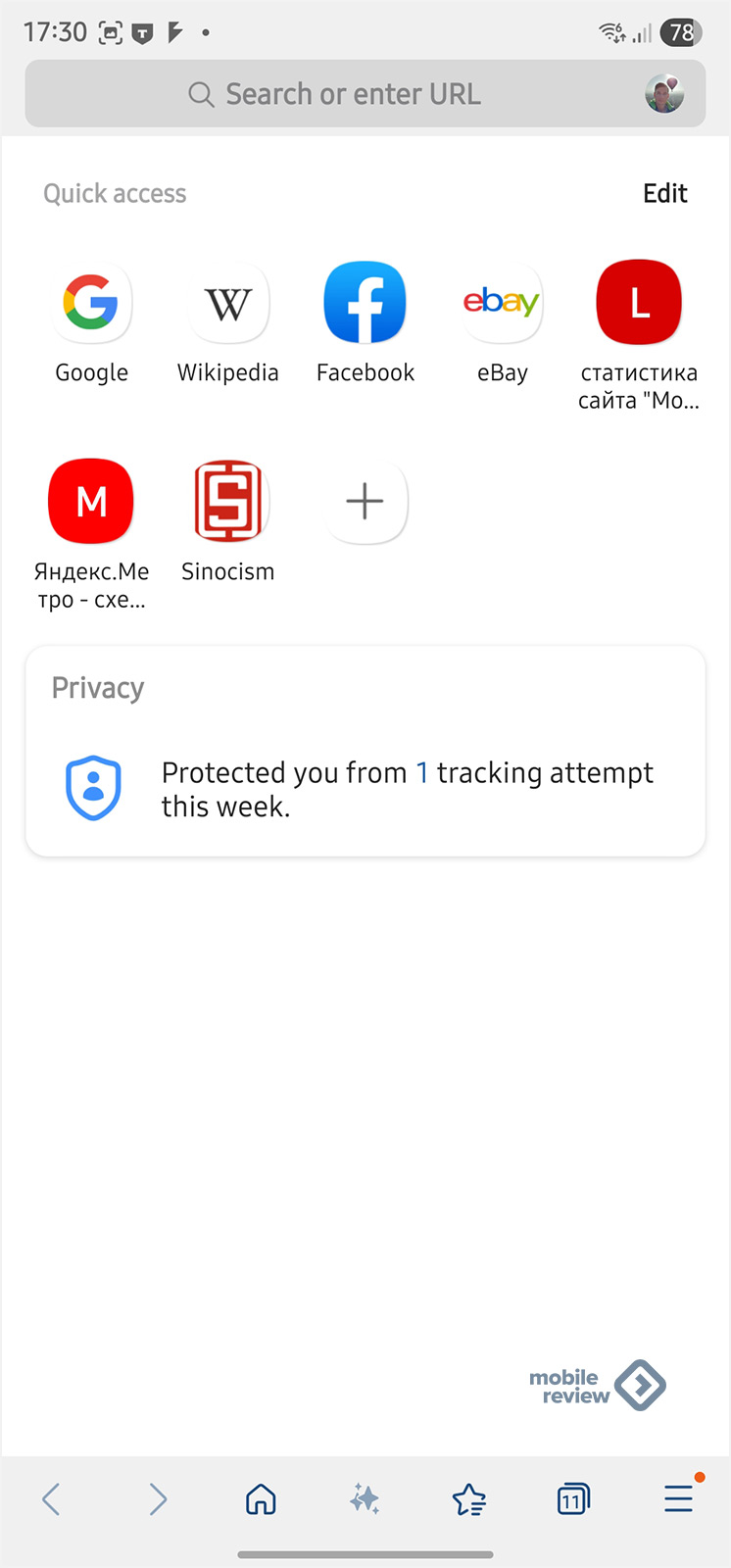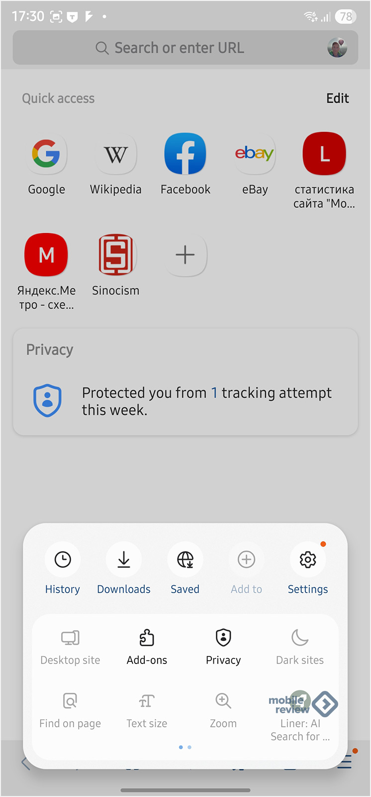 У Samsung Internet главная страница — это белый лист с иконками веб-сайтов. Список можно расширить или уменьшить. Под блоком часто используемых сайтов — быстрый доступ к разделу «Приватность», где включаются блокировщики рекламных баннеров и трекеров. Это удобно: некоторые сайты отказываются работать, если включён блокировщик, и переключатель должен быть под рукой.