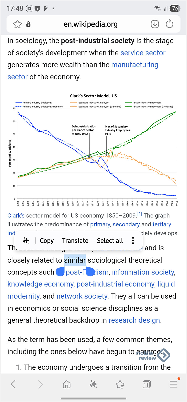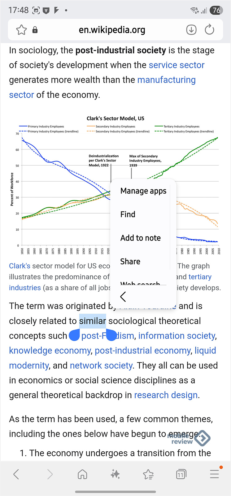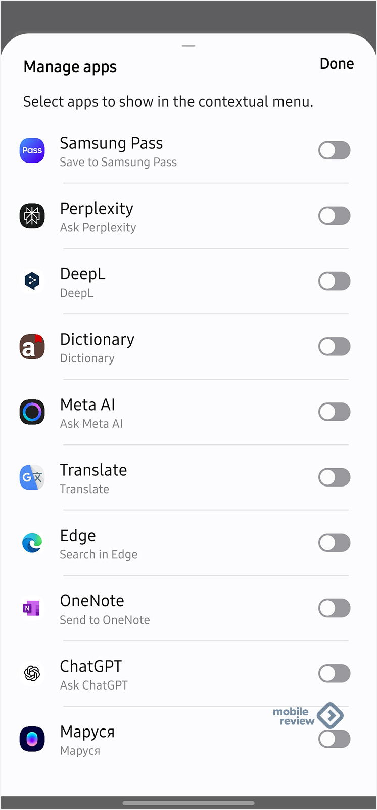 Также настраивается контекстное меню. Если выделить слово на веб-странице, появится окно действий: копировать, перевести, выбрать всё и т.п. В расширенной версии есть «Управлять приложениями» — можно выбрать, какие приложения будут в меню. Я, например, добавляю словарь иностранных языков и Perplexity. Единственный минус — пока нельзя менять порядок элементов: чтобы добраться до словаря, приходится нажимать «три точки» и открывать расширенное меню.