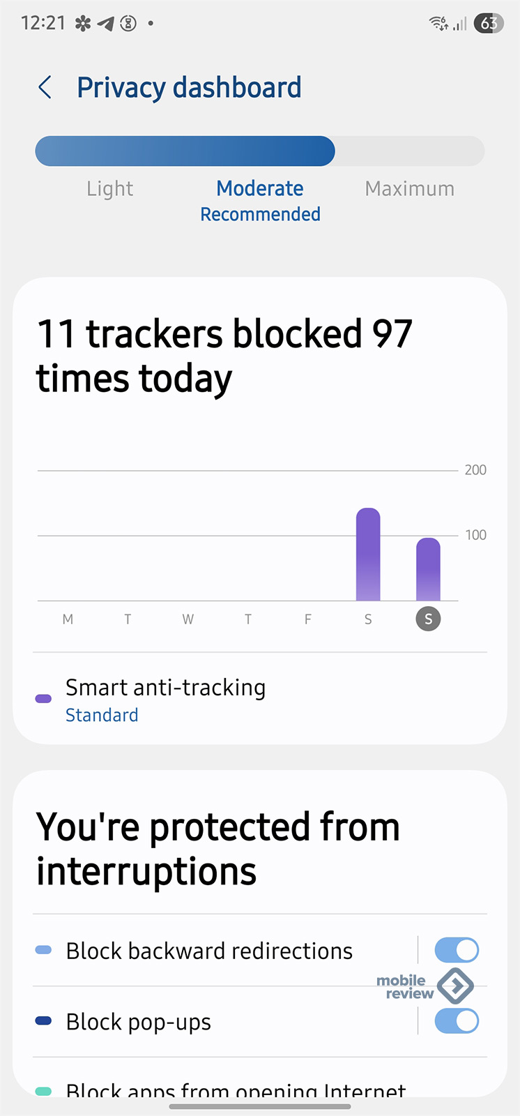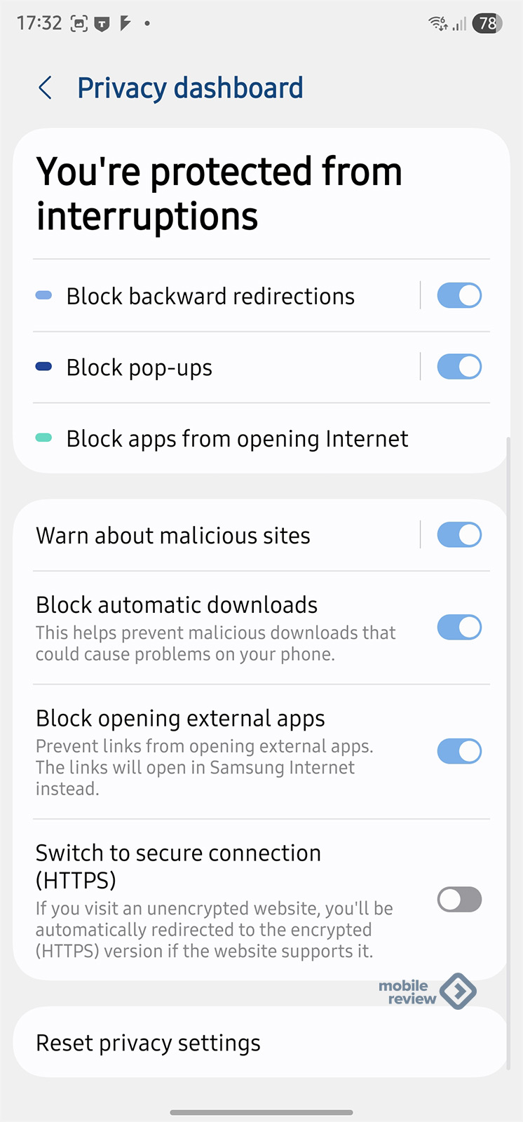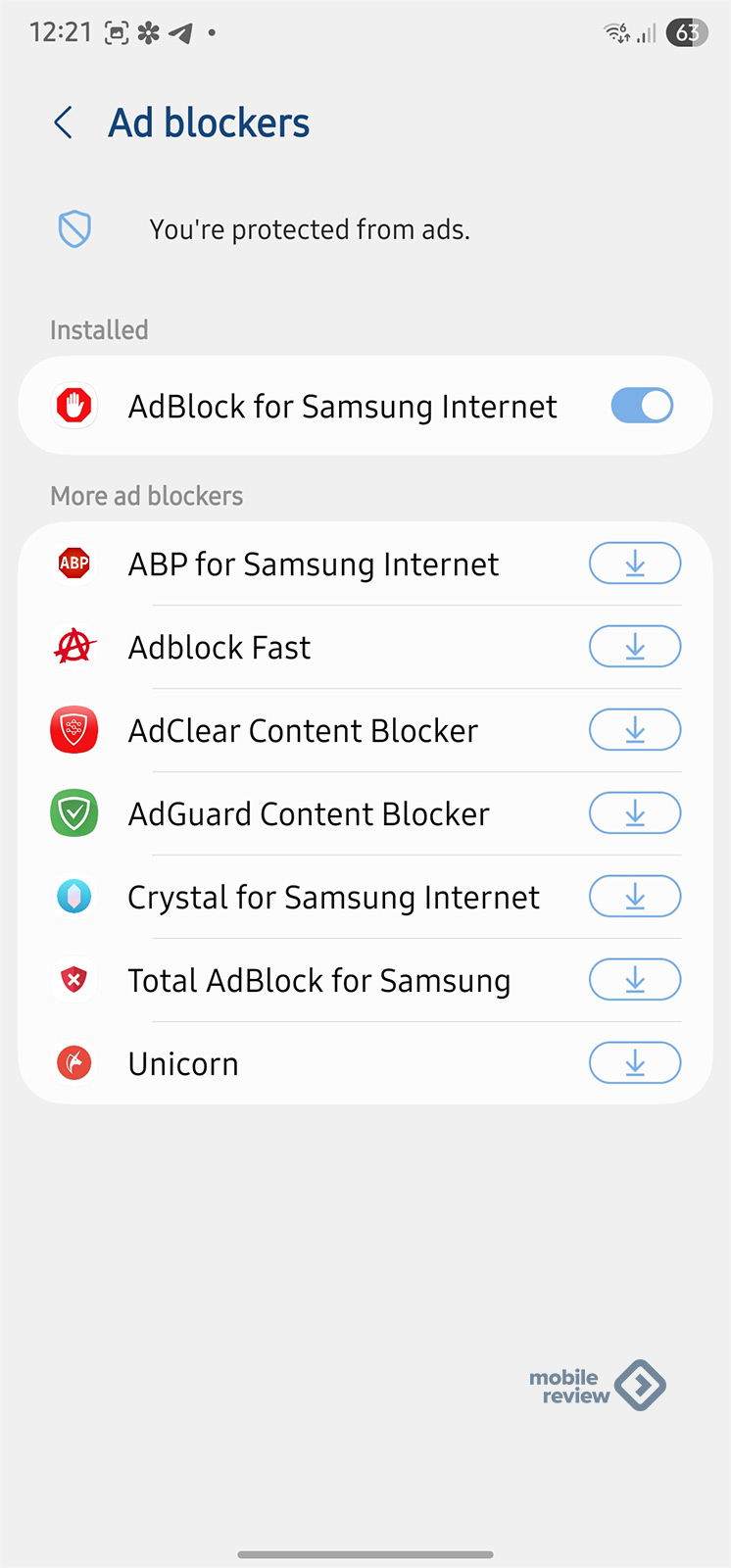 В Samsung Internet есть удобная панель управления приватностью: можно блокировать трекеры и предотвращать открытие сторонних рекламных страниц. Для требовательных пользователей в разделе «Дополнения» (Add-ons) доступен список бесплатных блокировщиков, оптимизированных для Samsung Internet.