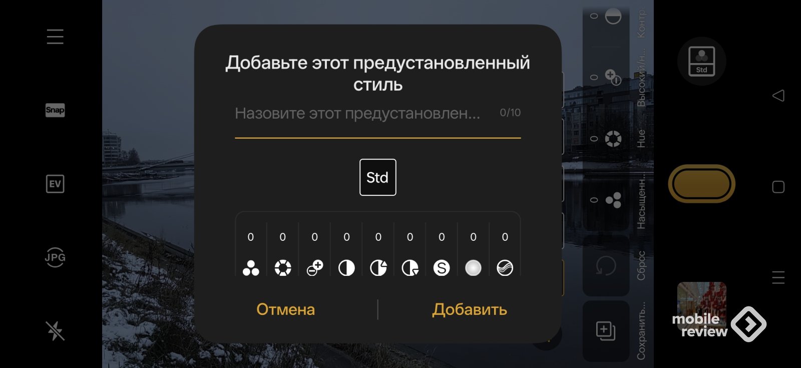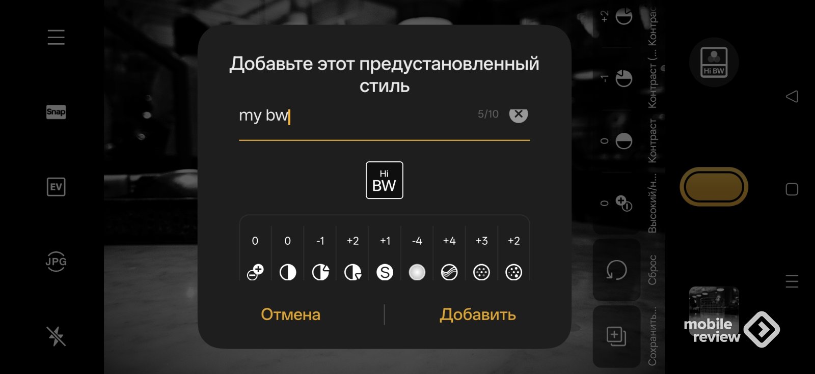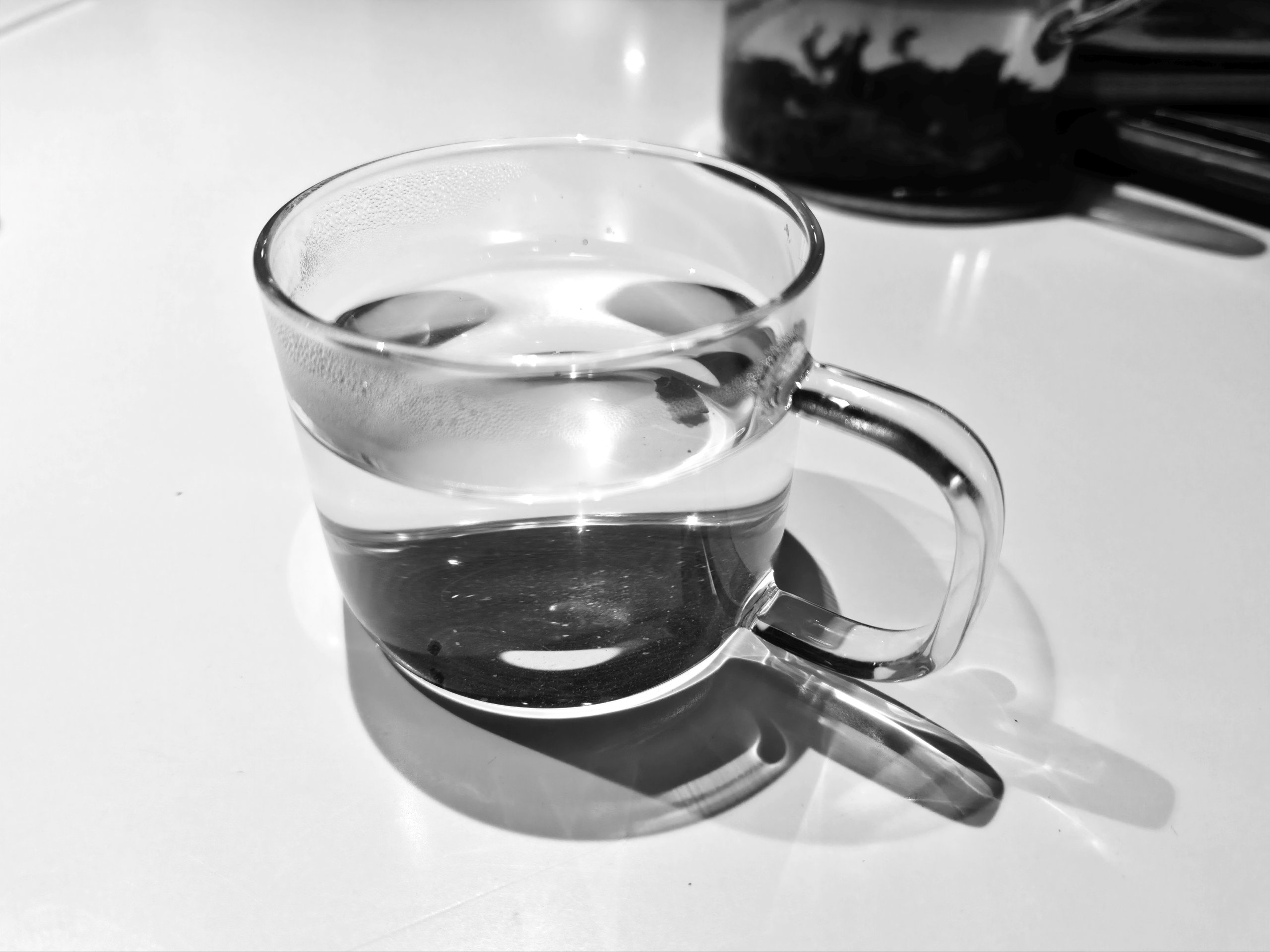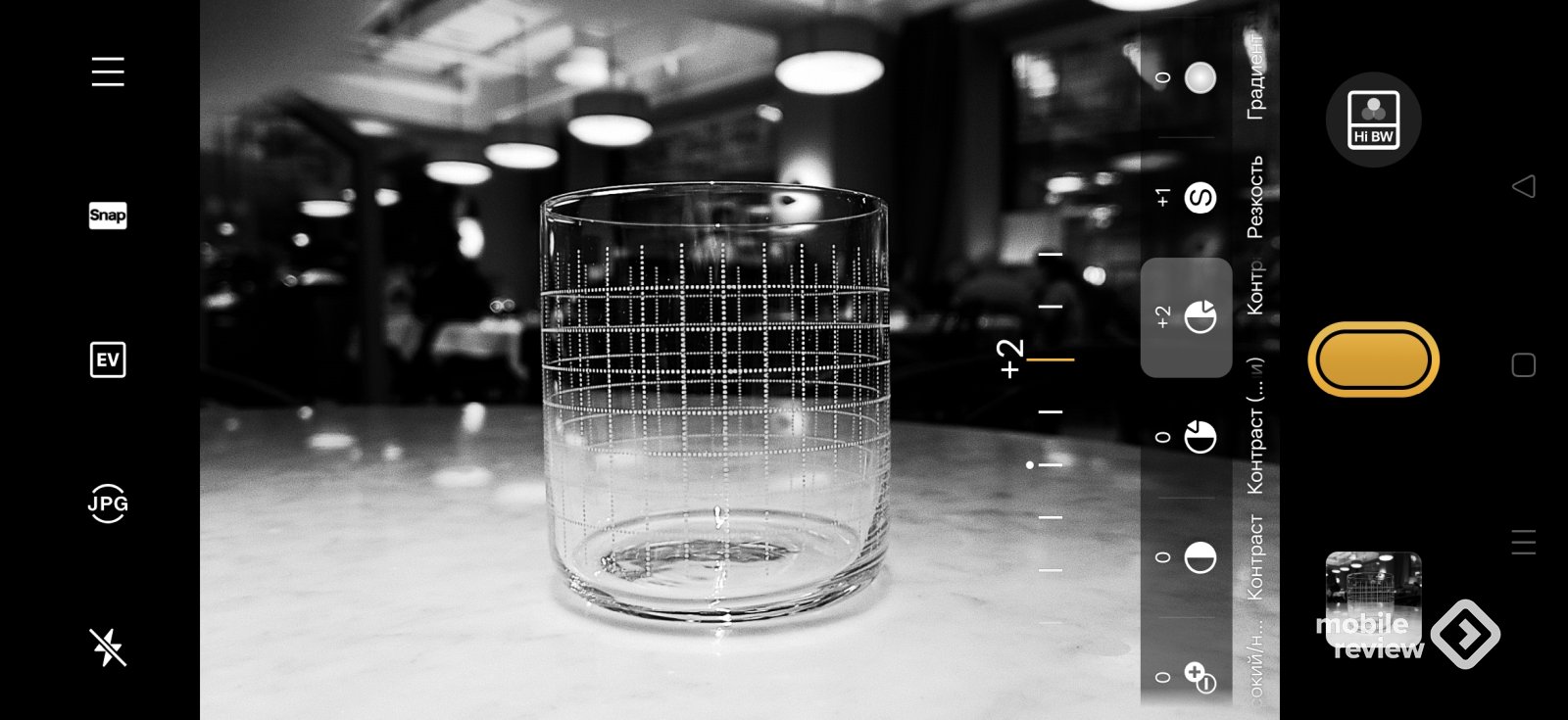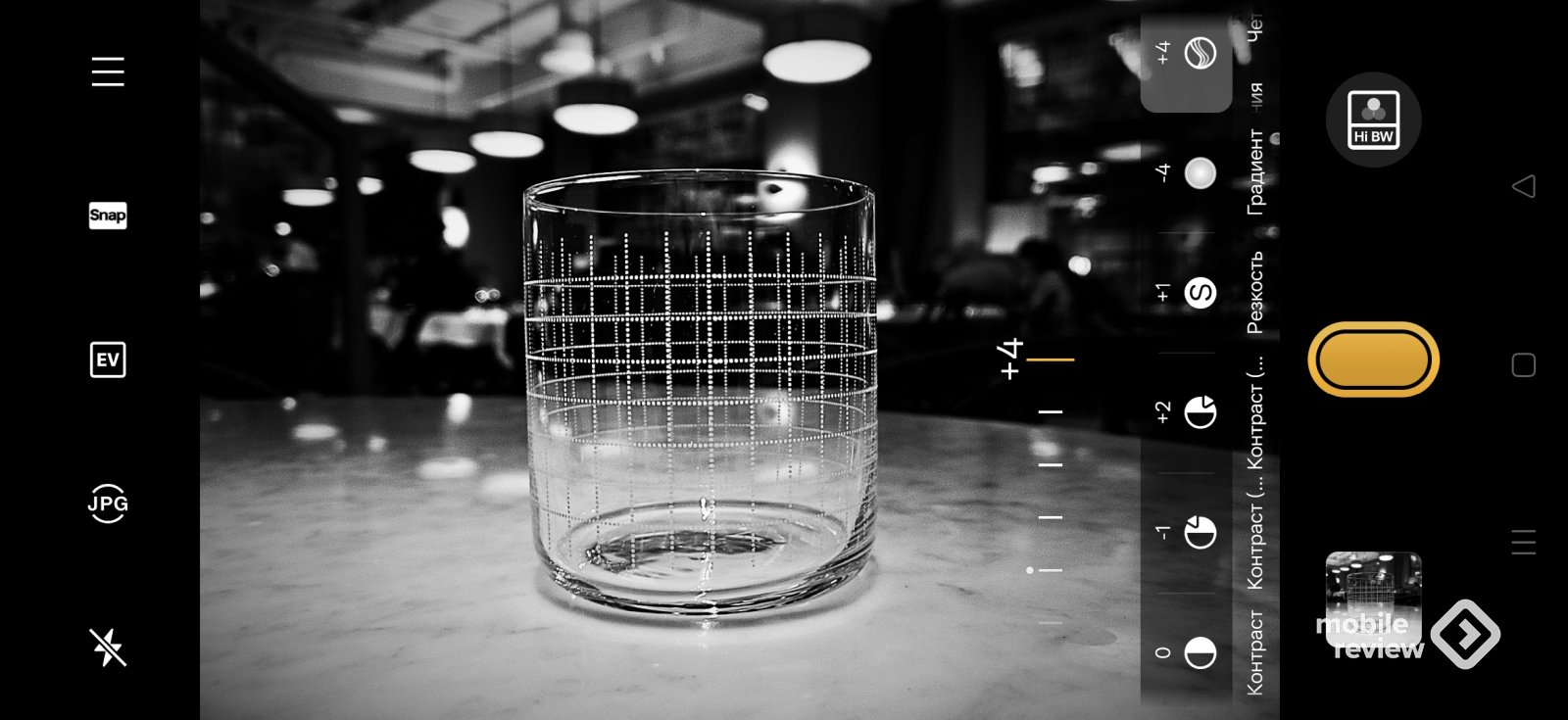 Допустим, вам нравится фотографировать черно-белые снимки с очень высокой контрастностью, размывать задний план. Я создал «тон» под себя с такими настройками, могу поделиться им с другими владельцами этого смартфона. Вот как выглядит фотография стакана с моим «тоном» (их еще могут называть рецептами, более того, их можно отправить пользователям камер RICOH). Согласитесь, что художественные возможности здесь неограниченные.
