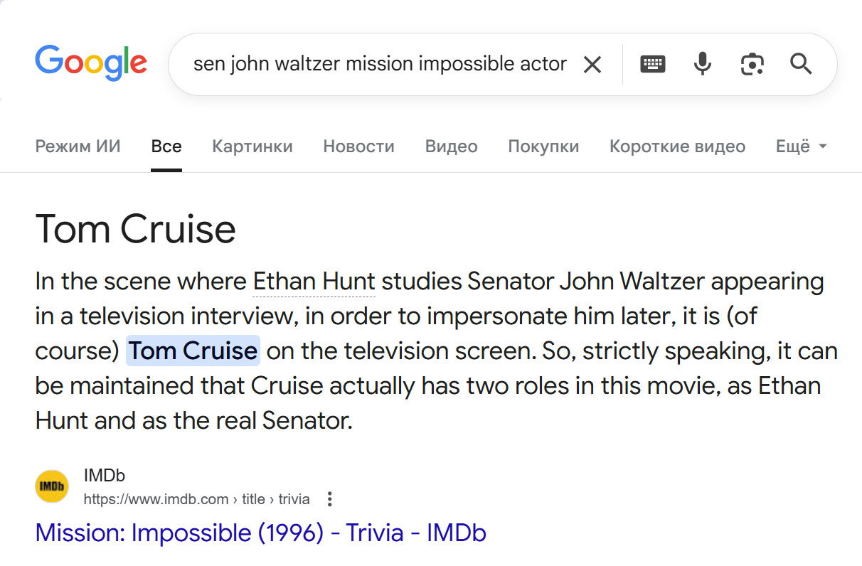 Так вот. В этом браузере Итан Хант ищет сочетание JOB 314 и браузер выдает заключение, что такой информации не найдено. Далее, к аналогичному результату приводит поиск сайта max.com (сегодня, кстати, этот домен ведет на сайт HBO). Эх, время было. Можно было застолбить адрес из трех букв. К слову, о трех буквах. То сочетание, которое искал герой Тома Круза изначально, в английском языке невозможно понять без контекста. Это может быть как слово «работа», так и имя Иов. Весьма интересная особенность языка.