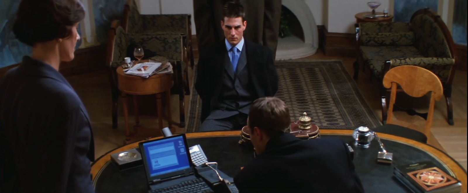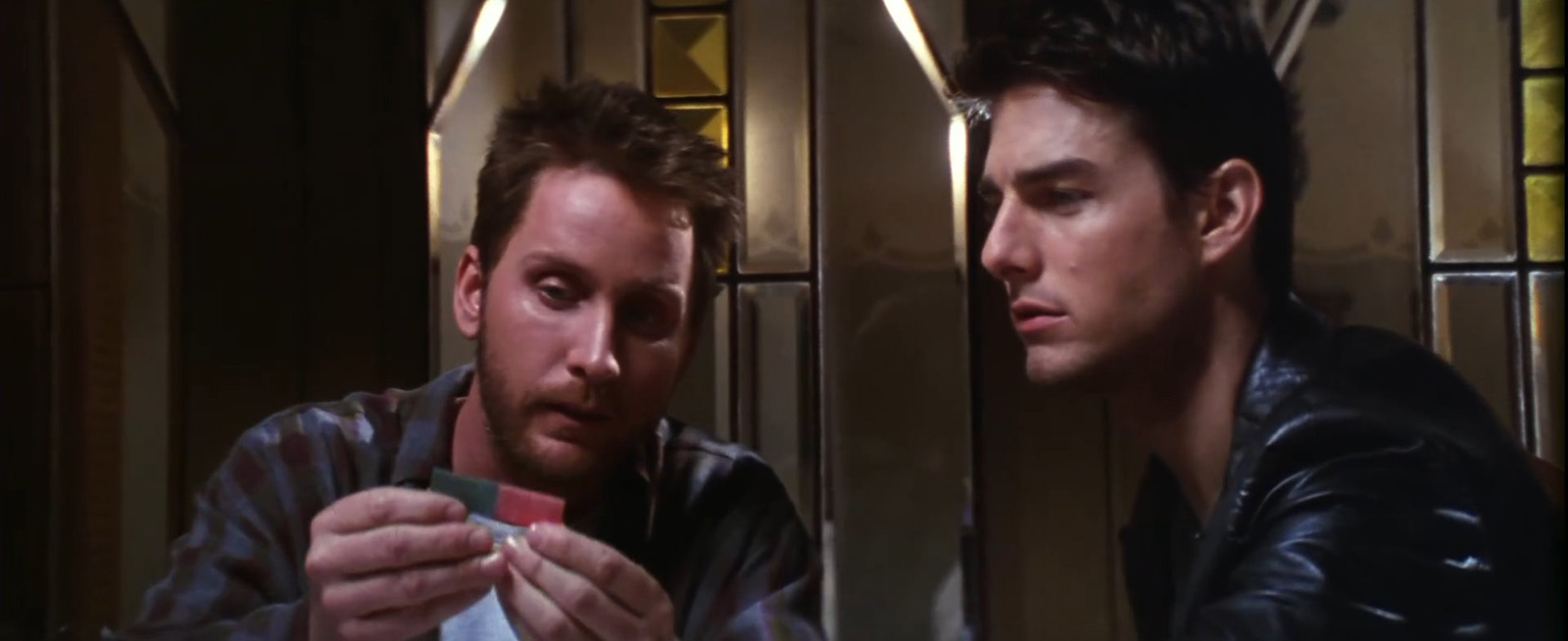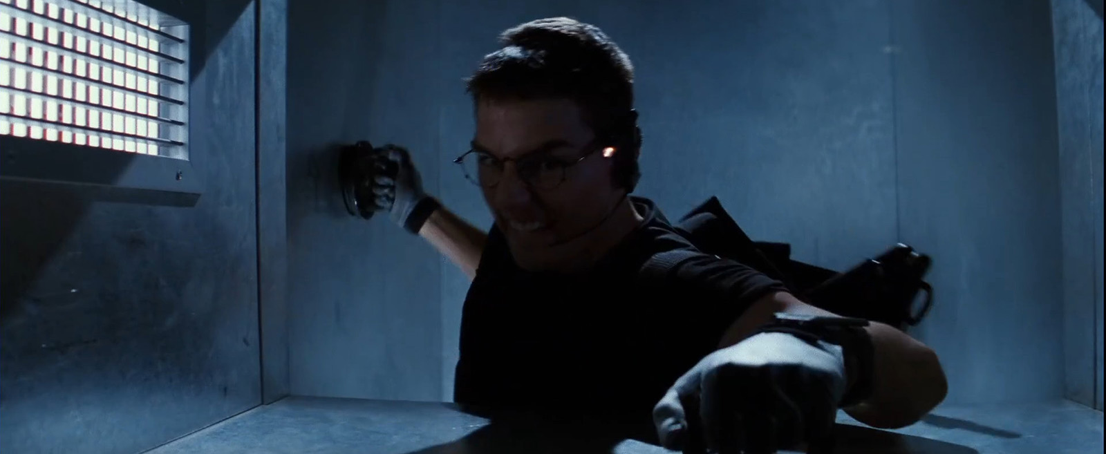 Эта сцена, кстати, лишний раз подчеркивает, что сотрудникам, которые долго сидят перед монитором, нужно чаще проверять зрение. Поскольку, как можно было не заметить в зеркальном полу висящего Тома Круза, для меня загадка.