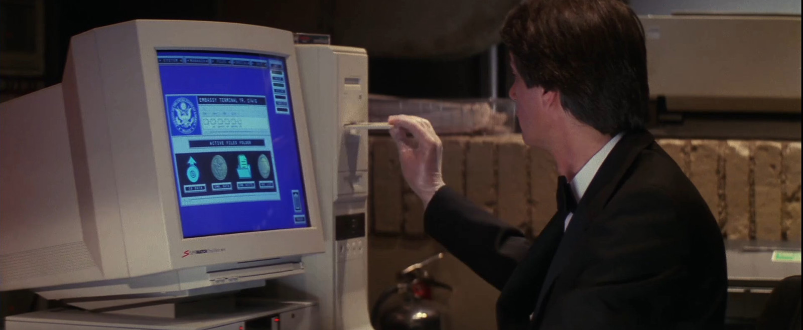 Но волновать это нас не должно, судя по всему. Главное, что работает. Возможно, речь шла о каком-то отдельном интегрированном в саму дискету передатчике, который активировался при старте вращения в дисководе. На это, в частности, указывает тот самый сканер с антенной над дисководом, который установили для отслеживания исходящих радиосигналов после включения дискеты. Право, не знаю. Может, и Брайан де Пальма просто плюнул на правдоподобность. Но все эти размышления отходят на второй план, поскольку нам показывают какое-то величайшее ноу-хау в способах скоростной подготовки. Уже через 25 секунд после включения дискеты мы видим подъезжающий автомобиль с группой захвата, которая экипировалась к этому заданию. А еще они ключевого руководителя операции привезли.