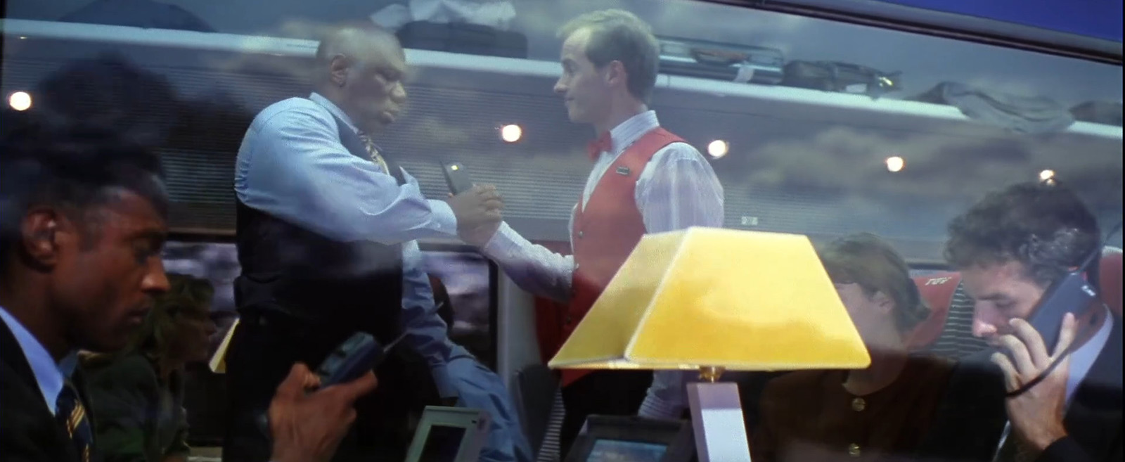 Операция проходит успешно. Данные похищаются. Герои благополучно сбегают. И нам остается только посмотреть на салон бизнес-класса в скоростном поезде, чтобы оценить проникновение сотовых телефонов.