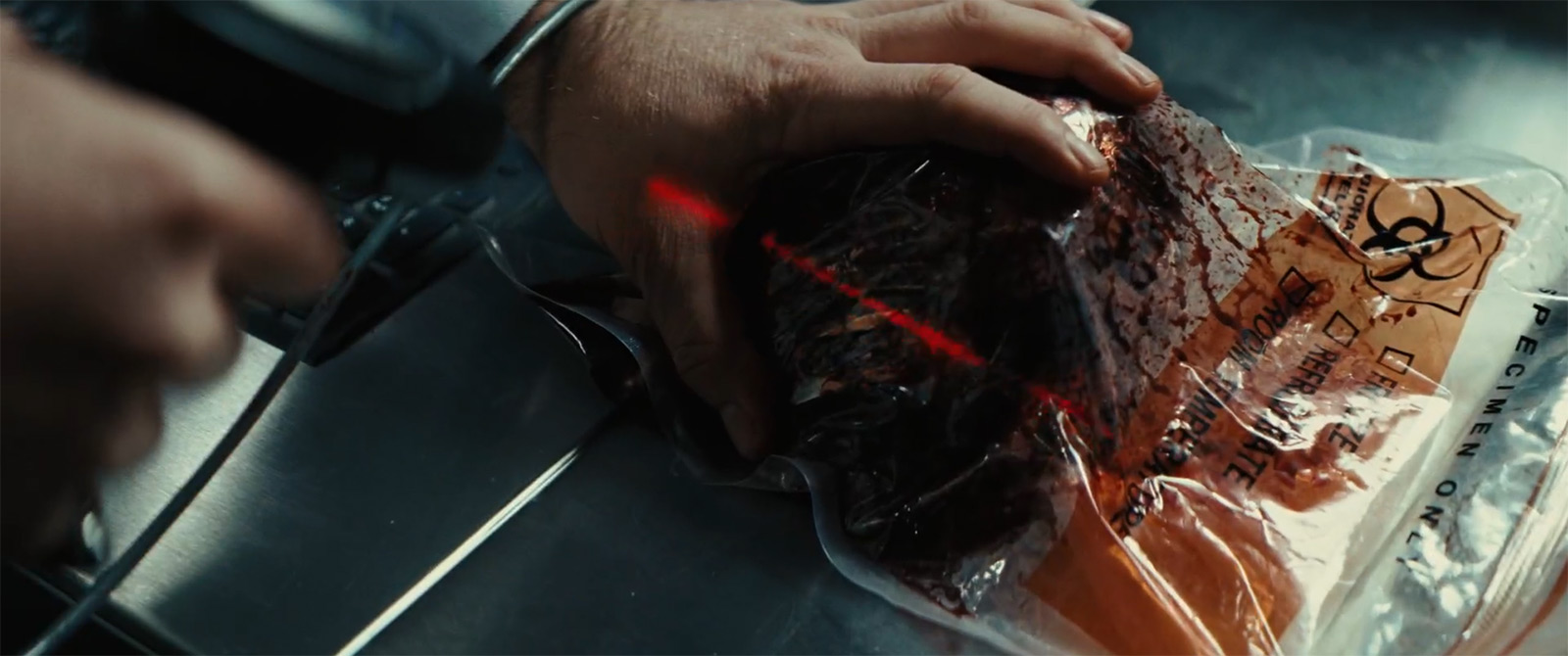 Другим интересным устройством, присущим миру будущего и месту работы главного героя в частности, является портативный сканер искусственных органов. Его работу визуализировали довольно эффектно вот в этой сцене: