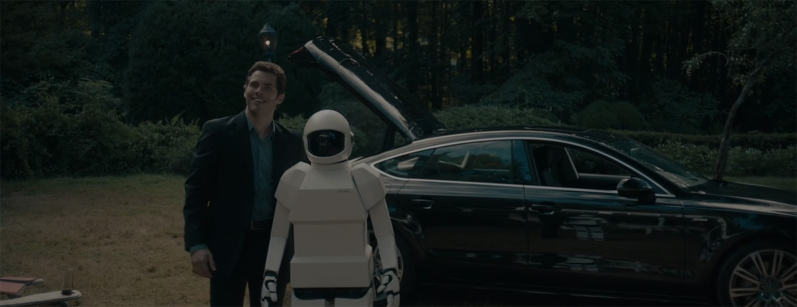 Роботы, к слову, в фильме представлены не только сиделками для престарелых людей. Мы видим отдаленный аналог модели Фрэнка в той самой библиотеке, куда главный герой приходит получать новые книги. Модель более специальная. У нее есть манипулятор, который используется для того, чтобы брать с полки книги, но вместо удержания на этом самом манипуляторе стопки из нескольких книг робот выполнен в корпусе коробчатой формы со специальным отсеком для перемещения этой самой стопки. И перемещение здесь тоже реализовано не на универсальном двуногом шасси, а на специальном колесном. Под стать одноэтажной плоской бесшовной поверхности со свободным проездом между стеллажами.