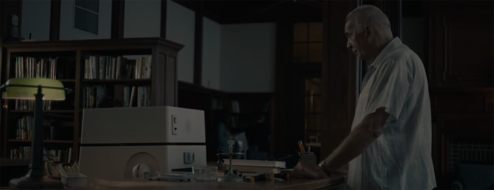 Впрочем, эти моменты не что иное, как демонстрация потерянности старика в этом новом мире, в который он просто не вписывается. Он, словно заблудившийся, бродит по городу, память в котором цепляется только за привычные ему места, уже не существующие в реальном мире. И единственным маяком остается только та самая библиотека. В ней мы видим еще одно веяние будущего. Прозрачные смартфоны: