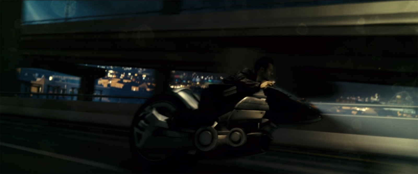 Дальше нам показывают личный транспорт будущего, который Сноу сумел реквизировать в процессе погони. Должен сказать, что во время первого просмотра в год выхода (2011) он мне показался откровенной глупостью, но после активного развития самокатов и моноколес мнение все же несколько скорректировалось: