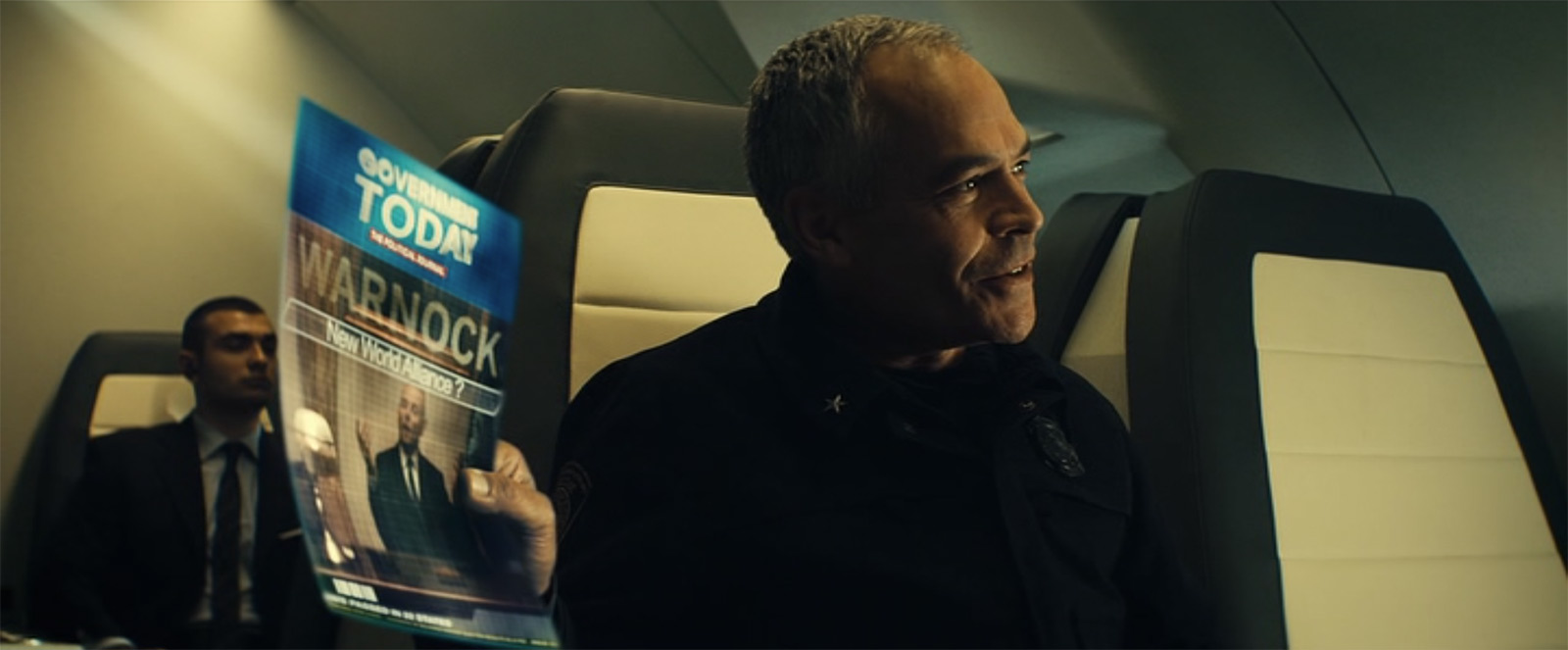 Выше вы можете видеть орбитальный шаттл, который доставляет дочь президента к той самой тюрьме, где в состоянии стазиса содержатся самые опасные преступники со всего мира. По пути нам демонстрируют еще одну особенность развития технологий будущего. Живые изображения в журналах.