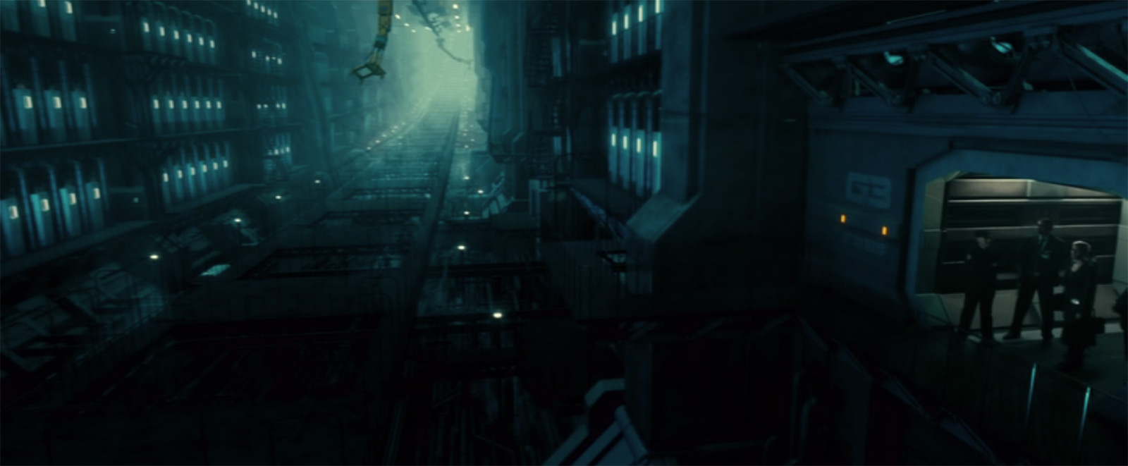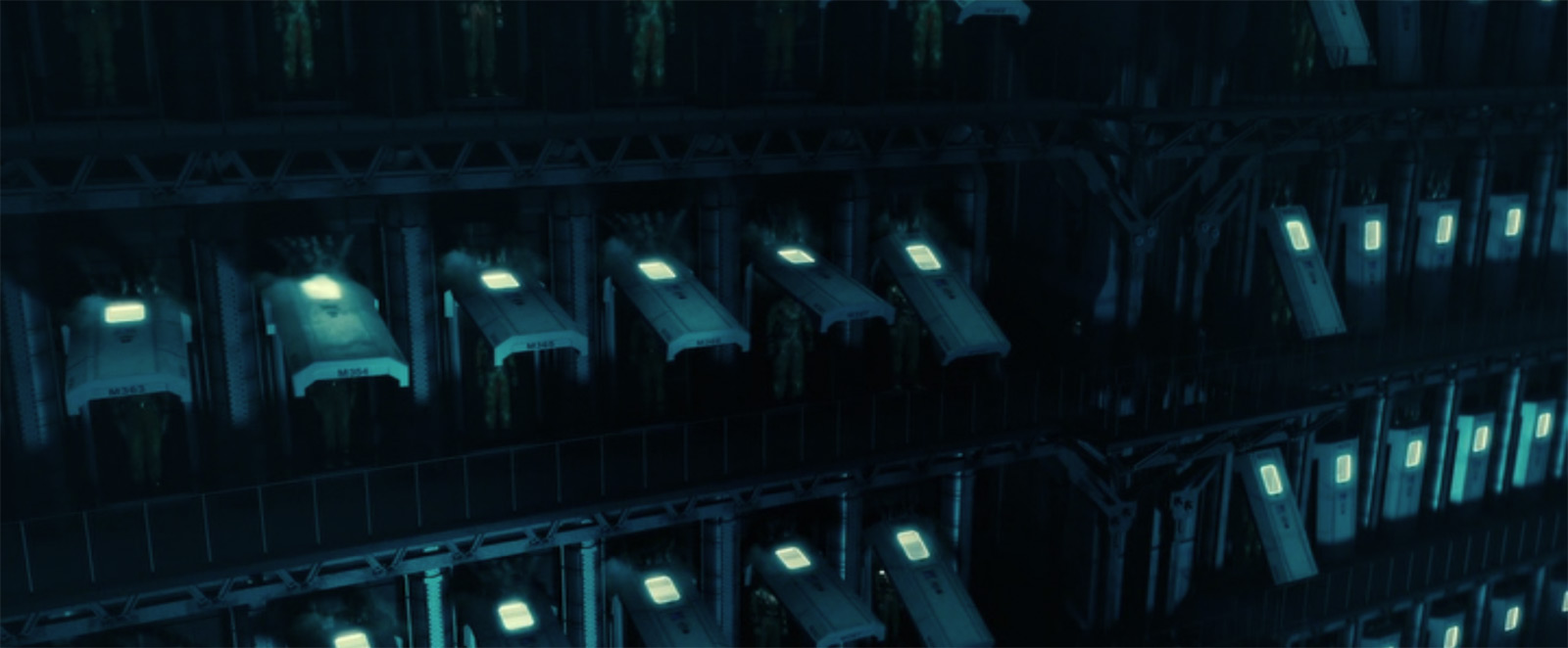 Капсулы напоминают аналогичные в сериале Fallout. Недавно посмотрел второй сезон и могу сказать, что Нолан все-таки может. Уж насколько я плевался с кадров со съемок и насколько впечатлен сейчас — это не передать. Не спугнуть бы удачу. А то «Мир Дикого Запада» тоже первые два сезона отлично шел (тоже Джонатан Нолан продюсировал), а потом что-то произошло, и мы досматривали не пойми что. Пусть здесь все получится. Так вот, капсулы. Одного из преступников размораживают (видимо, клешня на заднем плане как раз за ним выдвинулась), и начинается. Пока же оцените действия волшебной системы гравитации, которая удерживает посетителей тюрьмы в строгих костюмах аккурат на мостике перед этим огромным ангаром. Капсулы, кстати, могут быть открыты просто на своем месте. То есть, в принципе, никого не смущала возможная перспектива соскребать оттаявшего заключенного с мостика. Опасно быть преступником в будущем Люка Бессона.