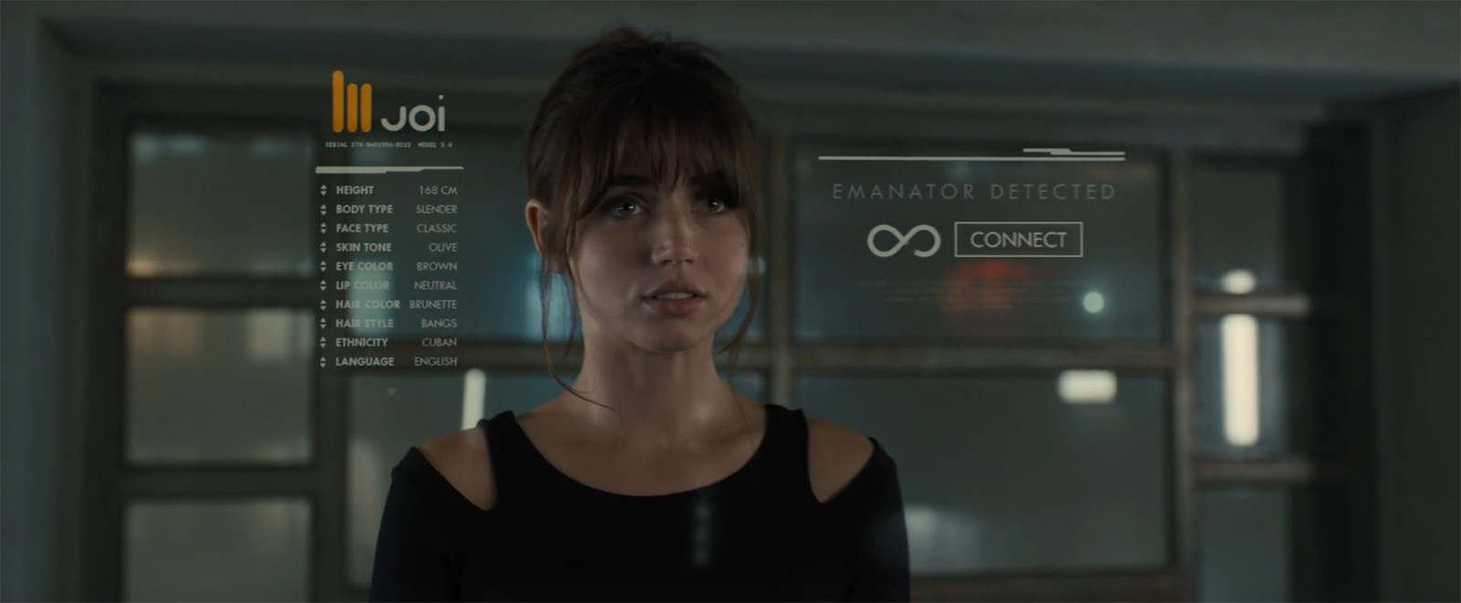 На изображении выше репликант дарит продвинутому голосовому голографическому помощнику устройство переноски, позволяющее выходить за пределы зоны действия квартирного проектора. А теперь потерпите небольшую параллель про людей. Телевизор в полстены, оборудованный стол с продвинутым компьютером, стриминговое оборудование, статуэтки по играм на полках, плакаты и т.п. С одной стороны, уют и дизайн. С другой — келья. Но это так, мысли вслух.