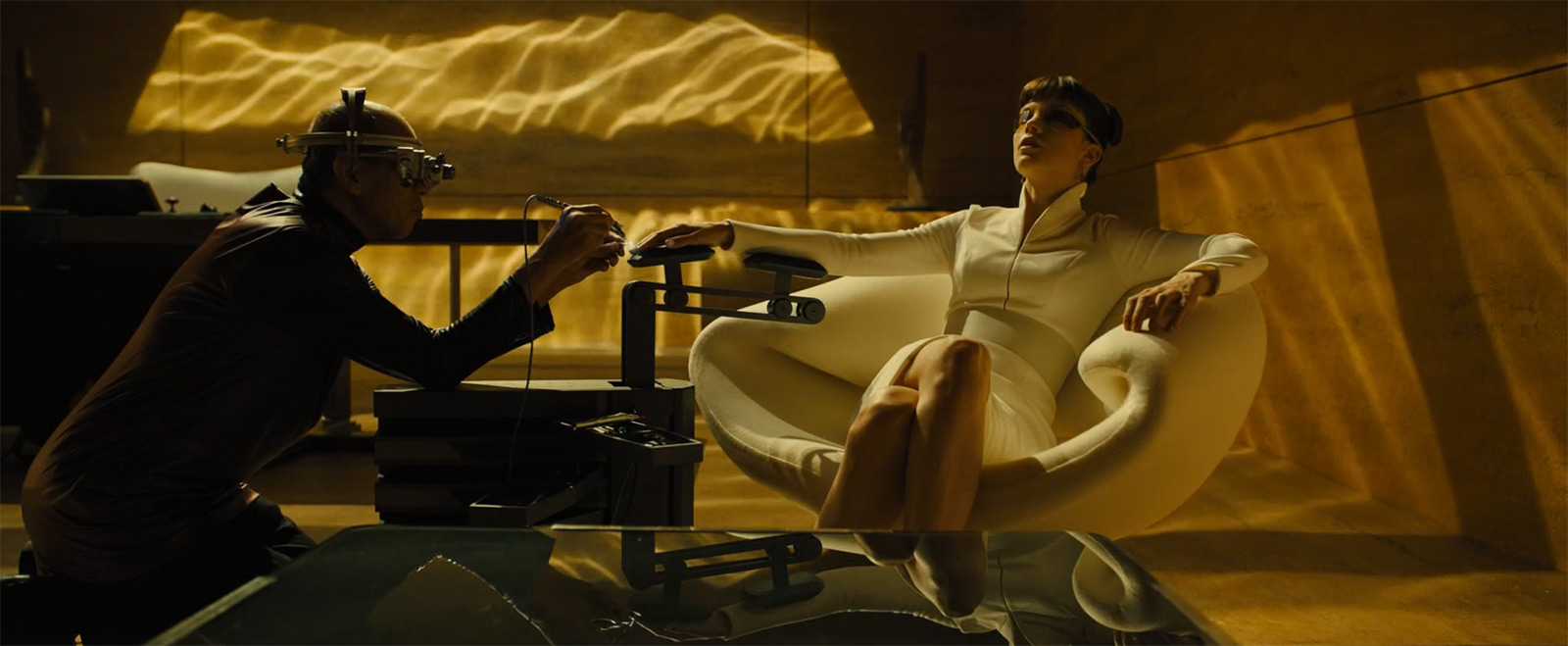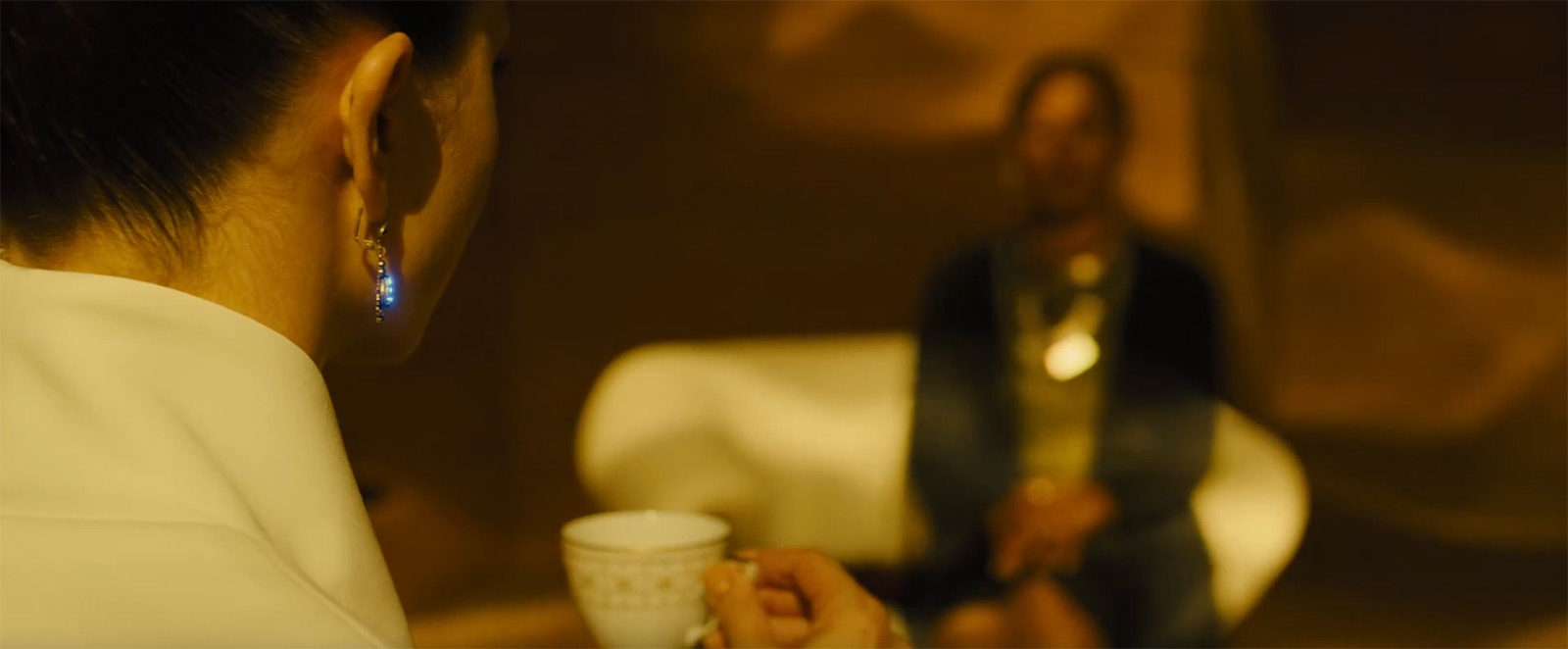 И вот только мы тут поразглагольствовали о том, что технологии сугубо прикладные, как фильм подбрасывает нам картину из другого социального слоя. Причем не в привычном сегодня понимании, когда мы видим очень состоятельных господ, которые едят черную икру ложками. Нам показывают репликантов, которые занимают более привилегированное положение, нежели остальные репликанты. И это осознание заложено в их программный код. Так вот. Отличия в социальном слое проявляются в том, что вместо банального «зашитого» в голову коммуникационного устройства мы видим украшение с интегрированным в него этим самым коммуникационным устройством.