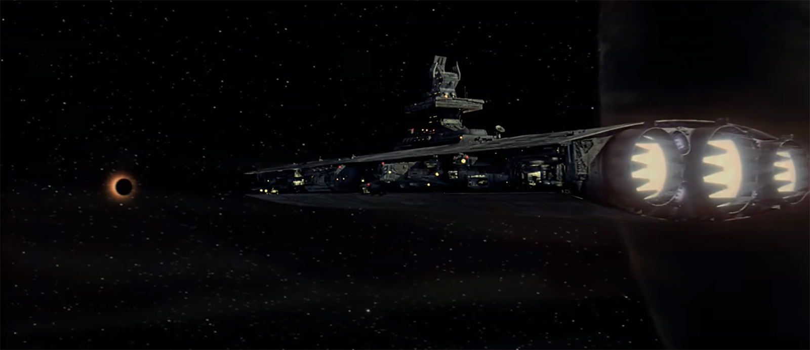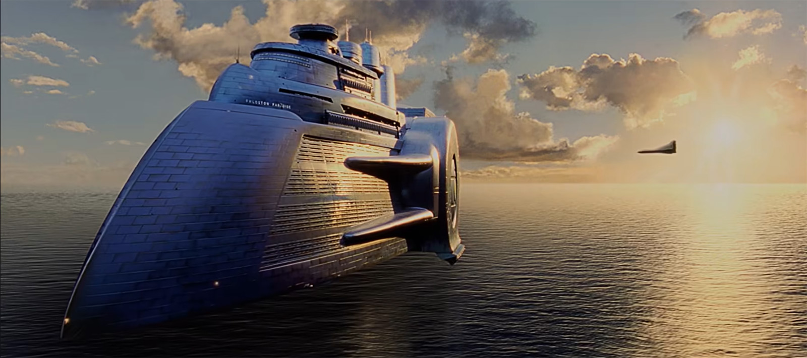 Шаттл взлетает. Никаких перегрузок и сбрасываемых ступеней, которые Илон Маск ловит на океанические платформы. Главное — после полета просто заменить капсулу со светящимся радиоактивным топливом. Оказавшись в космосе, пилоты уводят пассажирское судно в гиперпрыжок и приземляются на нечто напоминающее гигантский плавучий корабль, который летает вблизи чужой планеты. То есть здесь как бы решается та проблема с наблюдением за объектами в космосе, из-за которой критиковали иллюминаторы на мостике космического корабля в «Пассажирах». Нужды быстро перемещаться уже нет, а вот посмотреть за красивым космическим пространством можно:
