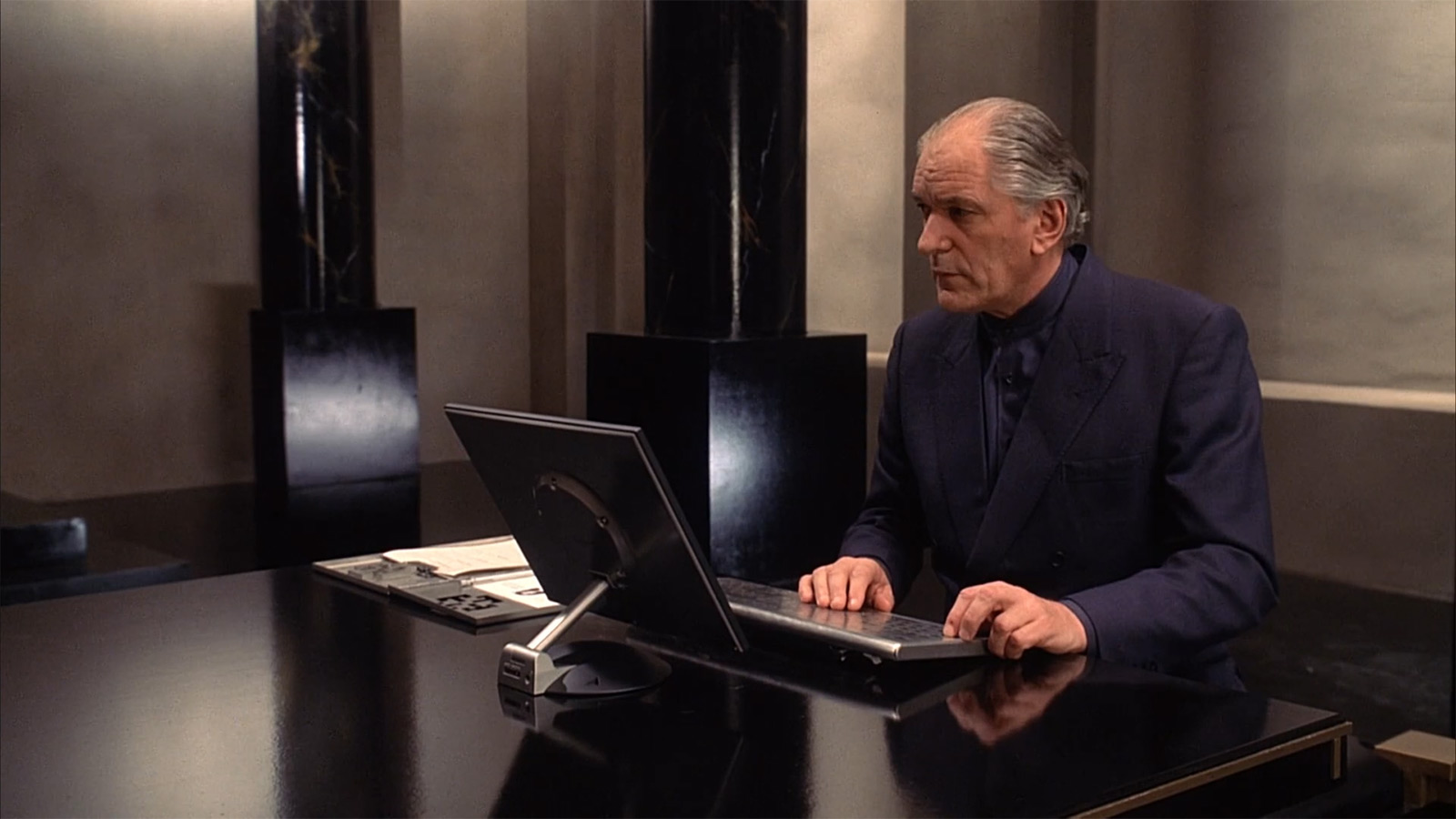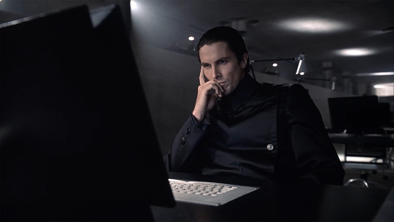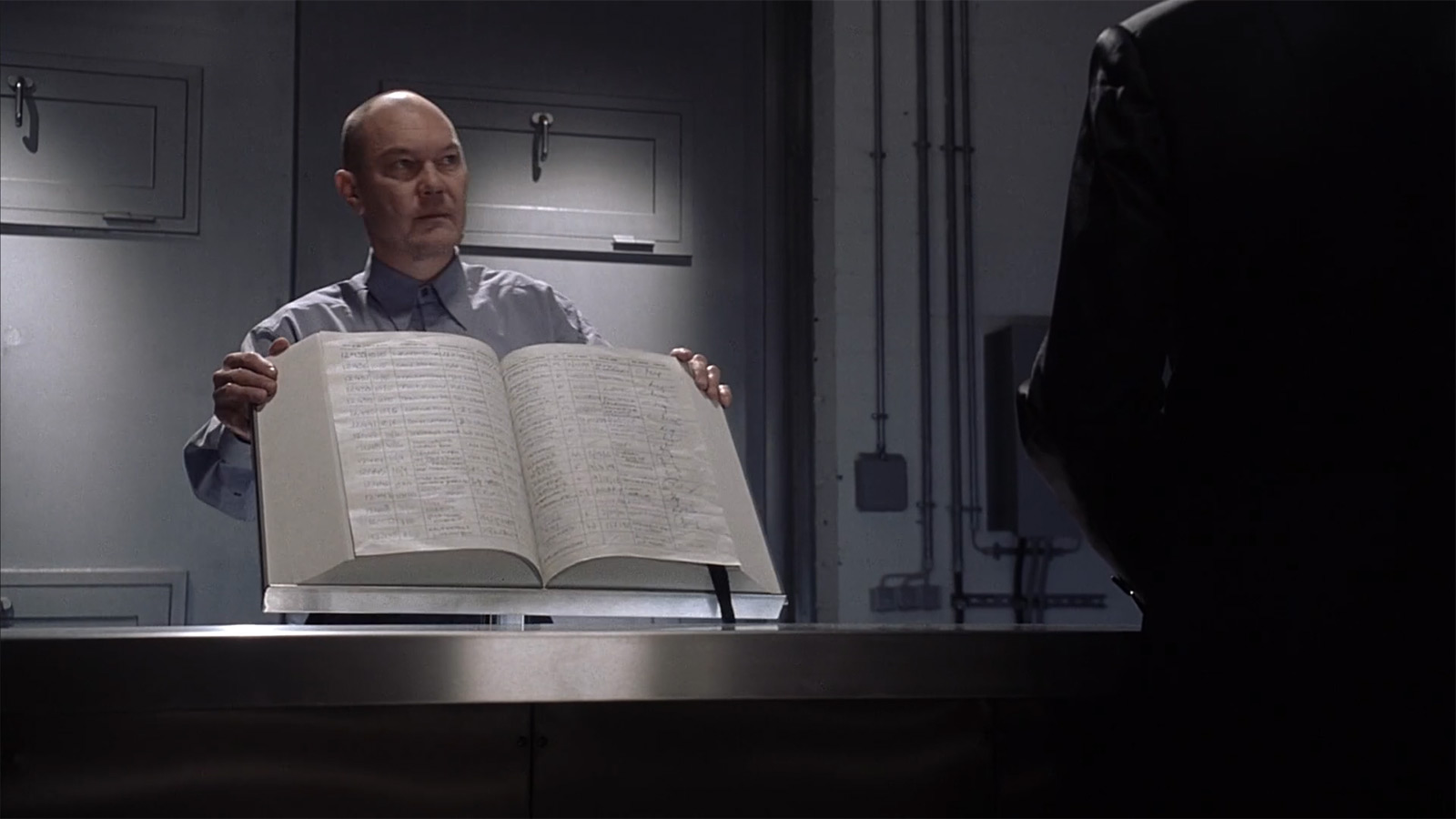 В первом случае мы видим Джона Престона (главный герой, которого играет Кристиан Бэйл), который что-то изучает за своим рабочим компьютером (клавиатура, как и в офисе из фильма «Дитя человеческое» снова утоплена в стол). А кадр ниже — это его визит в хранилище улик. Где у нас вместо компьютера уже стоит книга приема, которую заполняют вручную. А как же эмоциональная составляющая? Если верить книжным адептам, хруст страничек и шуршание бумаги — это прямо непередаваемые эмоции, а не эти ваши электронные бездушные дисплеи. Короче, промах, не иначе.