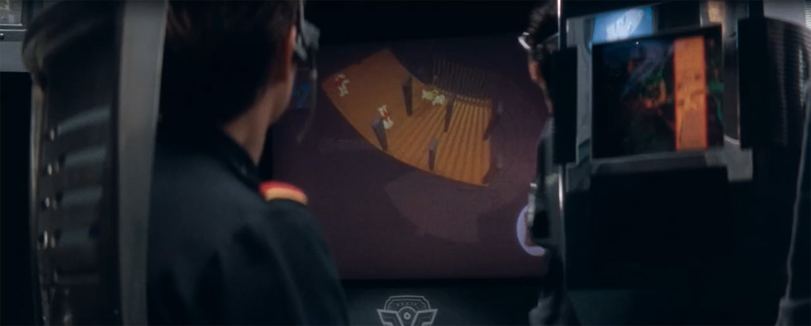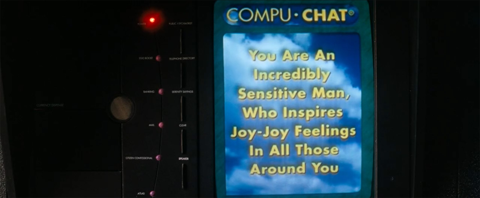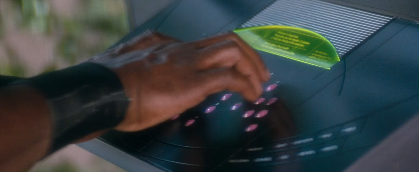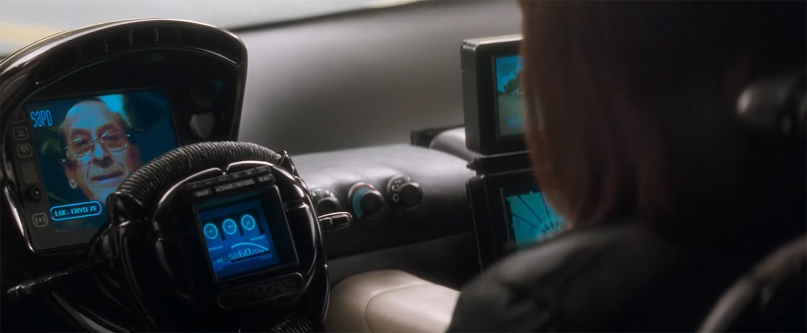 Необычно и приятно видеть отсутствие популярных сегодня сенсорных панелей. Прямо бальзам на душу. Ну и концепция неотвратимого наказания, которая подсвечивается в фильме, мне также по душе. В частности, в этой сцене за рецидив правонарушения в виде словесного воплощения аморального поведения к Фениксу отправляют патруль, чтобы провести внушение.