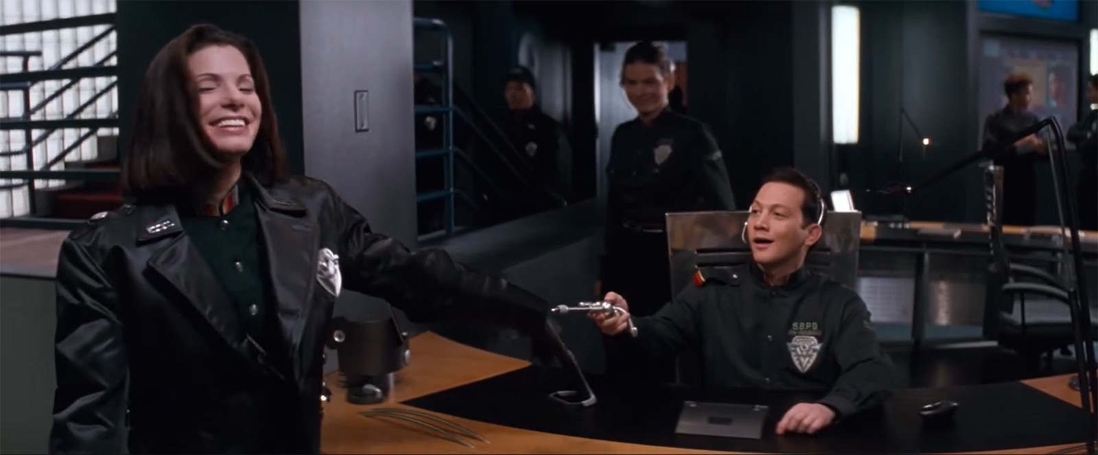 В полицейском же управлении также присутствуют бесконтактные технологии, которые использует сидящий на ресепшене Роб Шнайдер, сверяя документы входящих сотрудников с базой данных. Ну вы поняли, да? В тюрьме сличают людей, а здесь достаточно только документов.