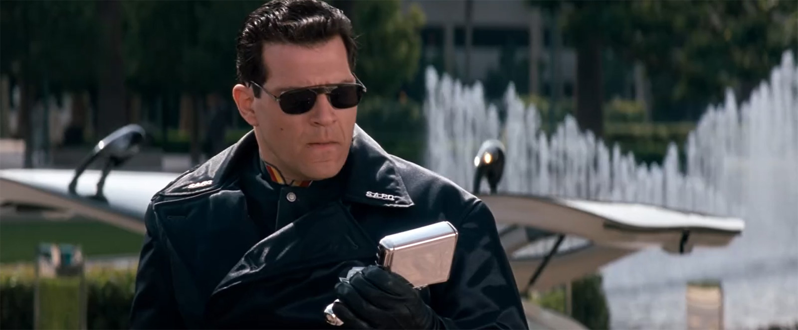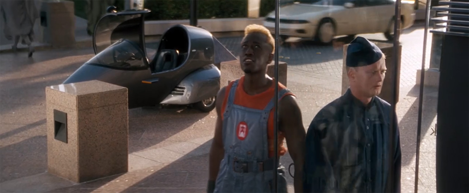 А в этот год нам показывают тот уровень технологического развития, которого миру удалось добиться, когда была побеждена преступность. Для начала их местный Стив Джобс таки показал миру планшеты, и они стали популярными. Один из них мы видим у начальника тюрьмы, где содержат Джона и Феникса. И ему звонит сотрудница полиции Лени́на Хаксли, которую играет Сандра Буллок (всегда говорил «Баллок», но, оказывается, правильно именно «Буллок»).