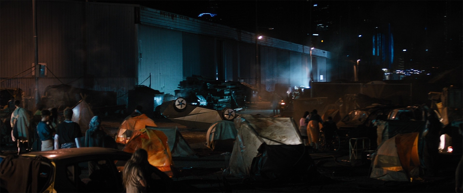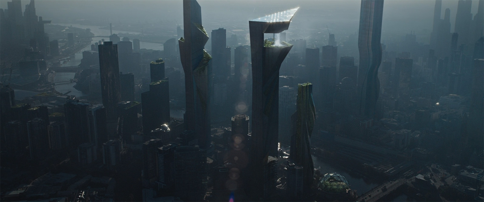 Город будущего по задумке создателей фильма выглядит весьма привлекательно. Архитектура нарочито искажается в угоду дизайну. Озеленение пространства идет в направлении притяжения к деньгам, видимо, поскольку масштабные архитектурные строения прямо кричат о заботе об экологии: