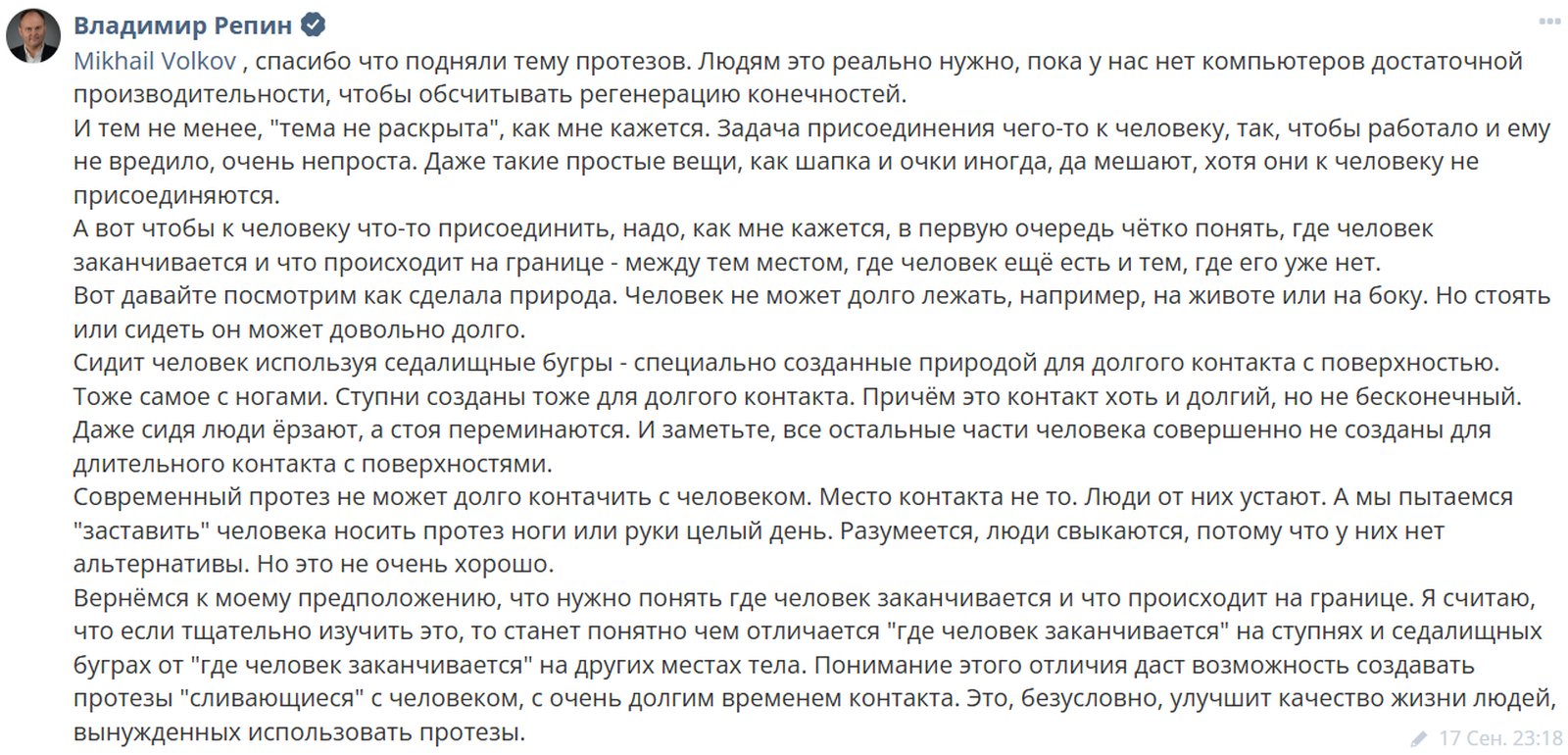 Думаю, что идея уже понятна. Требуется та самая нейронная модуляция, которая должна настроить мозг так, чтобы он воспринимал протез как конечность. Уверен, что подобный подход ни для кого не новость, и применительно к протезам кто-то наверняка уже располагает прототипами. Но здесь есть и второе дно. Если мозг получиться убедить в том, что протез — это не протез, то, в чем еще его можно убедить? Очень похоже на то, о чем говорил Питер Тиль в своем недавнем интервью. Мы писали о нем вот здесь.