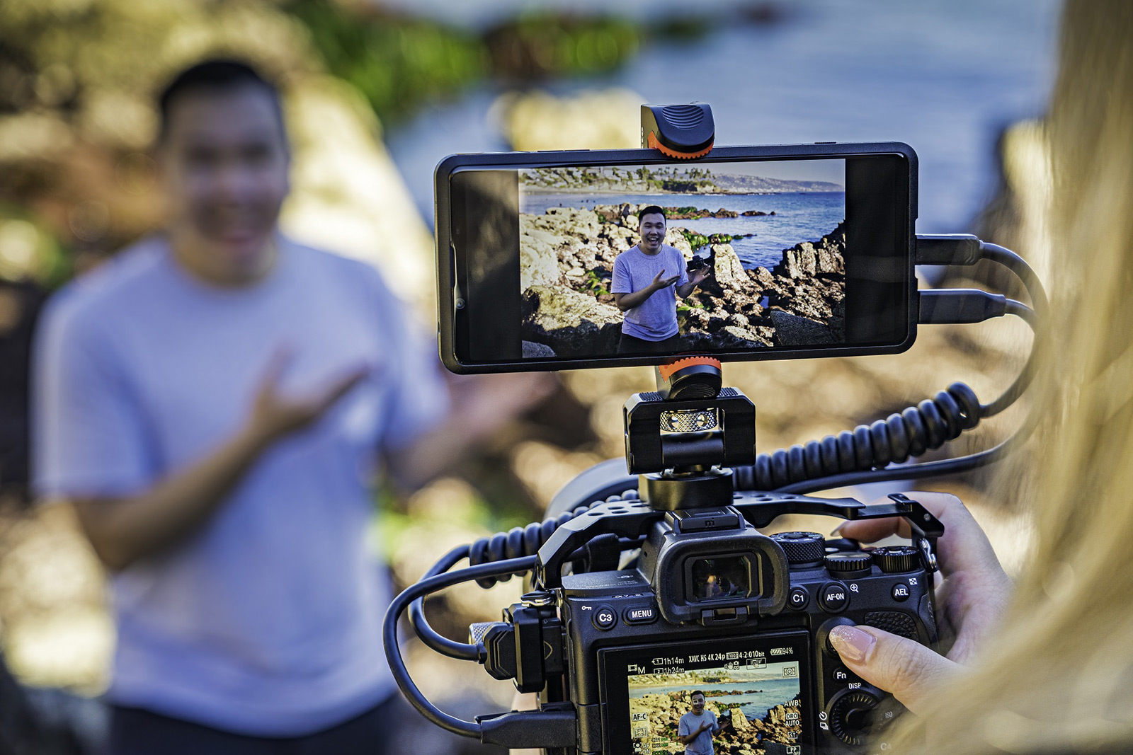 Это снова Sony, которые предлагают использовать свой смартфон Xperia Pro 5G в качестве внешнего экрана и устройства для трансляций вместе с камерами семейства Sony Alpha. Это решает проблему и с передачей файлов с фотоаппарата на смартфон, поскольку фотоаппарат превращается, по сути, просто в оптику. Кроме того, появляется возможность вести онлайн-видеотрансляции, используя профессиональную оптику. Также одной из функций была возможность сразу же загружать сделанные снимки на внешний сервер благодаря коммуникационным возможностям подключенного к камере смартфона. Система не выстрелила. Стоимость Xperia Pro 5G на старте продаж в США составляла 2499 долларов, что сильно сузило потенциальную аудиторию покупателей. Однако мысль, я считаю, была верная. Это не отдельные объективы на смартфон, которые делают его несуразным. Это полноценная профессиональная съемка. Софт подкачал. Да и форма в сборе все же не та. Центр тяжести конструкции не тот. Возникает ощущение, что профессиональная съемка — это куча проводов и всевозможных кронштейнов. На снимке выше рекламщики прикрыли основной позор, но вот вам кадр «с полей»: