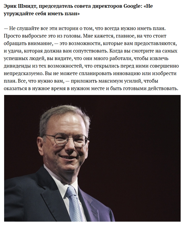 Другим отличным подходом является идея, что стратегия разрабатывается и внедряется по ходу ее разработки. То есть можно сказать, что она в чем-то пошаговая. Иными словами, у вас просто нет какой-то конкретной цели. Неслабо, правда? А между тем это логично. Какая может быть глобальная цель у человека, который придумал электромобиль? Заместить все автомобили с ДВС? С точки зрения предпринимателя на конкурентном рынке, — да, цель именно такая. Перераспределить все деньги в свою пользу и сесть на их горку (метафора). С точки же зрения нового сегмента и тех самых голубых океанов так делать не следует, поскольку возникающие перекосы в производствах, социальной сфере, экологии, на рынке труда и прочих сферах просто невозможно будет учесть в типовой стратегии уничтожения конкурентов. Именно поэтому «голубой океан» во многом опирается на реакционную методику с постоянной оценкой ситуации и подстраивание под возникающие обстоятельства. Упрощенный вариант этого подхода можно встретить у другого должностного лица в компании Google: