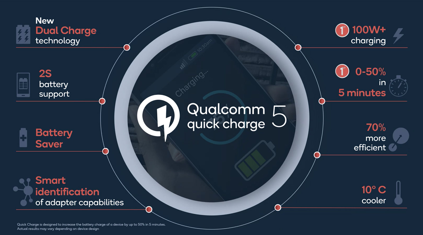 Дальше идет технология Qualcomm Quick Charge (QC). Она особенно популярна у смартфонов с процессорами Snapdragon. Последняя версия — QC 5+ — тоже поддерживает до 100+ Вт, но совместима и с Power Delivery, что делает ее удобной и универсальной.