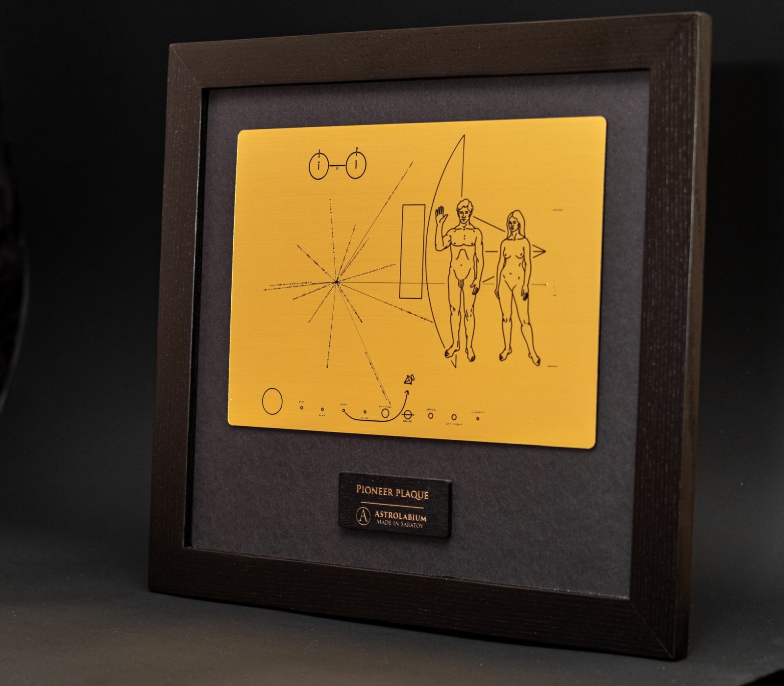 И тут я, кстати, вспомнил одну штуку, которая этот парадокс подчеркивает еще круче. «Пластина Пионера». Слышали про такую? Это две позолоченные таблички из алюминия, которые улетели в космос в 1972 и 1973 годах на борту аппаратов «Пионер-10» и «Пионер-11». Их авторами были астрономы Карл Саган и Фрэнк Дрейк, а рисунок подготовила Линда Саган. И вот что они туда засунули: мужчину и женщину на фоне силуэта корабля, схему атома водорода, пульсарную карту — по сути, адрес Солнца относительно центра галактики, и схему Солнечной системы, где четко показано, что аппарат вылетел с третьей планеты.