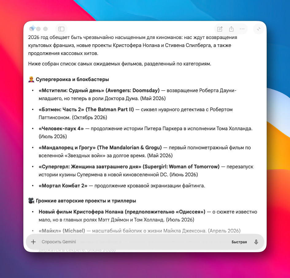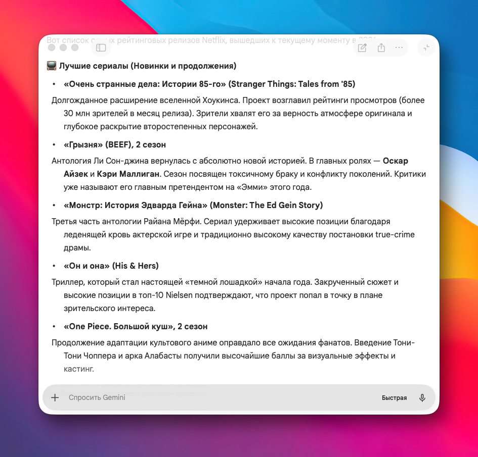 Нейросети можно использовать в качестве навигатора для развлечений, чтобы снять себя муки выбора, что посмотреть этим вечером. Когда возникает ощущение, что я уже все пересмотрел, на помощь приходит Gemini.