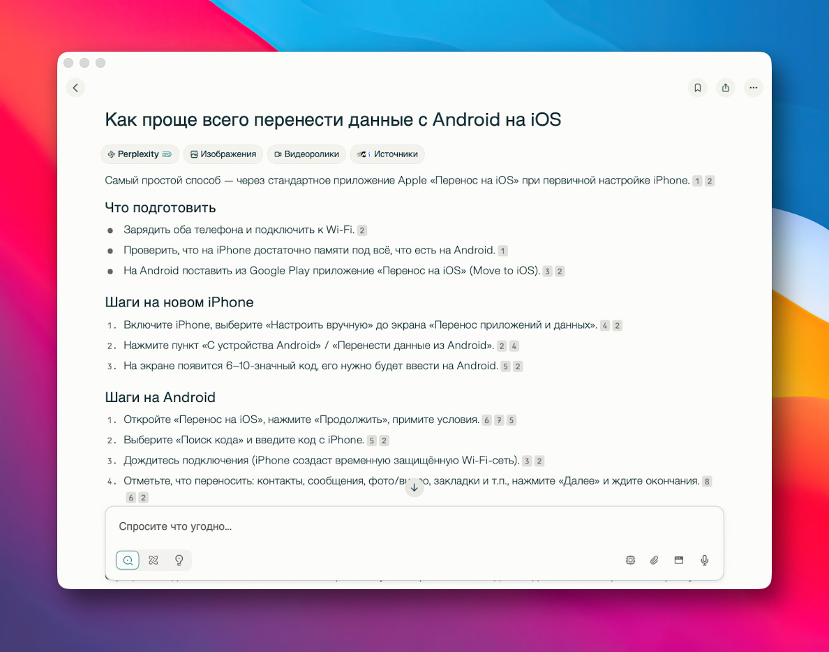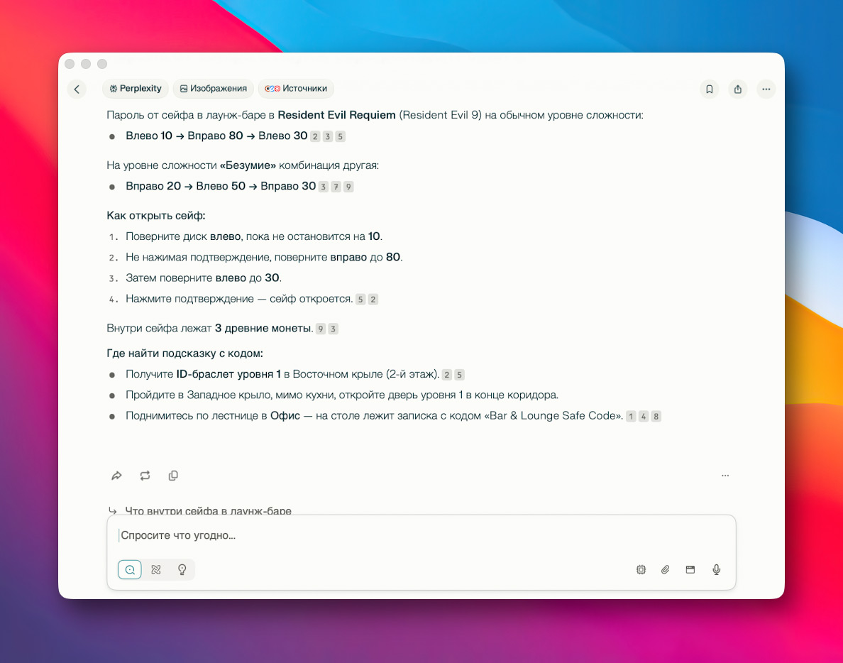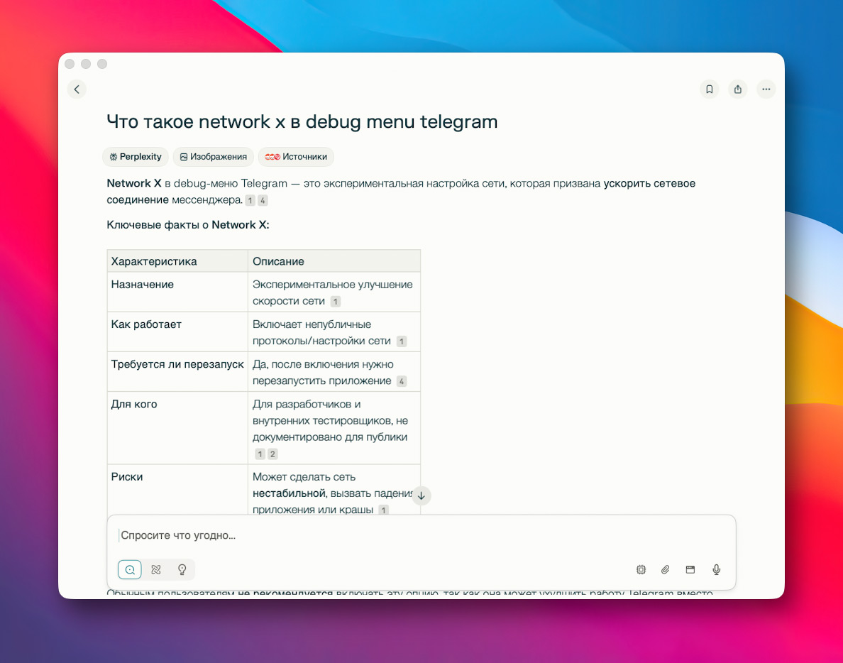 Таким образом с помощью Perplexity я мгновенно получаю ответы на свои вопросы. Могу оперативно использовать полученную информацию без необходимости в монотонном поиске по ссылкам и без трат времени на ожидание ответа от человека.