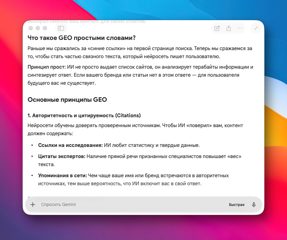 Загоняем источник в Gemini или ChatGPT, а затем просим объяснить простым языком. В качестве короткого примера из моих узкопрофильных запросов: «Объясни доступно для широкой аудитории основные принципы geo-оптимизации».