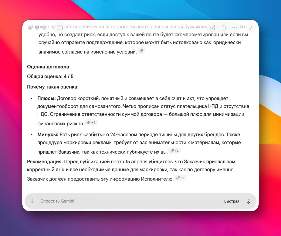 Нейросети вполне могут выступать в качестве юридического консультанта на базовом уровне. Я ежедневно работаю с рекламодателями: есть постоянные клиенты, с которыми у нас уже сформировались типовые соглашения и прочая сопутствующая документация. Работа не стоит на месте, поэтому появляются новые бренды/компании. На стадии предварительного обсуждения договоров я загоняю файл в Gemini и сопровождаю запросом: «Оцени этот договор и сделай для меня перечень рисков как для исполнителя, а также оцени договор по 5-бальной шкале». В итоге меньше чем за минуту я получаю краткое резюме, которое позволяет мне принять определенные решения.