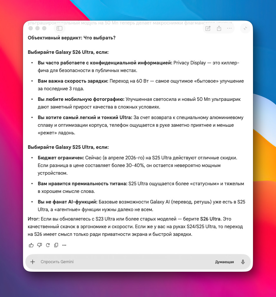 Можно подбросить монетку, но лучше озадачить выбором нейросеть и получить усредненный ответ. На скрине ниже Gemini помогает выбрать между Samsung Galaxy S26 Ultra и S25 Ultra, а я на 100% согласен с его резюме.