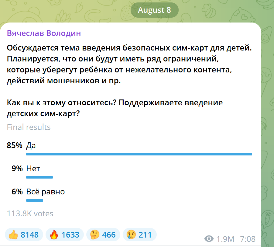 Впервые тема детских SIM-карт возникла в августе 2025 года. На форуме «Цифровая эволюция» глава Минцифры Максут Шадаев сказал следующее: «Минцифры предлагает ввести детские сим-карты, которые будут иметь определенные настраиваемые родителем средства фильтрации трафика. До 14 лет». Дальше эта темы всплывала в разном качестве и от разных людей. Тогда же Вячеслав Володин провел опрос о полезности таких детских SIM-карт, найти его можно вот тут.