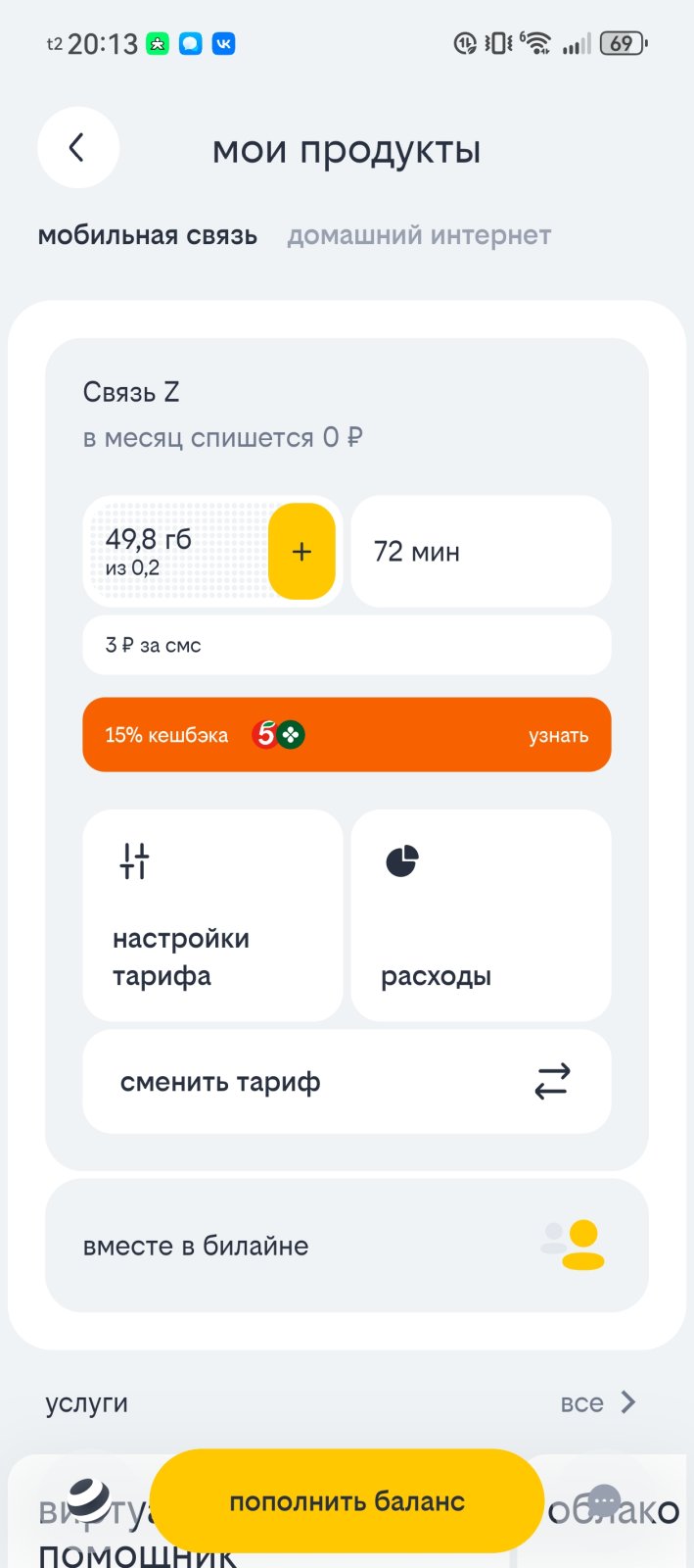 Найти ответы на сайте билайна у меня не получилось, поэтому я отправился в мобильное приложение. Оно, кстати, тоже круто изменилось. И не могу сказать, что в лучшую сторону. Я потратил добрых пять минут, пытаясь найти, где экран с новыми тарифами. Посмотреть новые тарифы можно, только провалившись с домашнего экрана в «Мой тариф» — «Сменить тариф». А я кнопку «Сменить тариф» нажимать не люблю. Всем известно, как операторы любят перетаскивать пользователей на новые более дорогие тарифы, а я своим «Связь Z» дорожу.