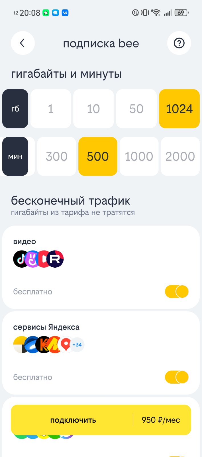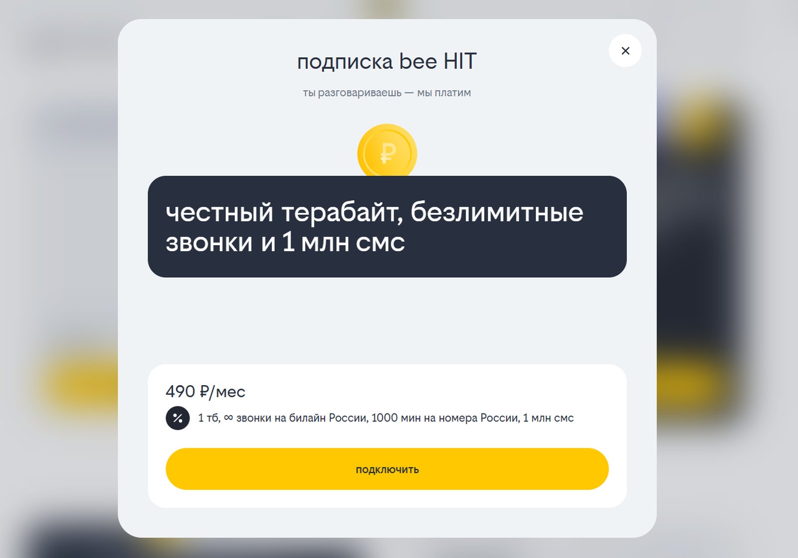 Обратите внимание, что на плитках нет слова «Подробнее», а только уверенное «Подключить». Страшно! Это все-таки выбор тарифа, а не президента. Тут решение так быстро не принять. Но дальше — больше! Перекрестившись, нажимаю «Подключить» и… плитка просто становится крупнее. Из новой информации — только то, что это «подписка bee HIT» и снова призыв «Подключить». Зачем нужен этот промежуточный экран? Наверное, чтобы настроился решительнее.