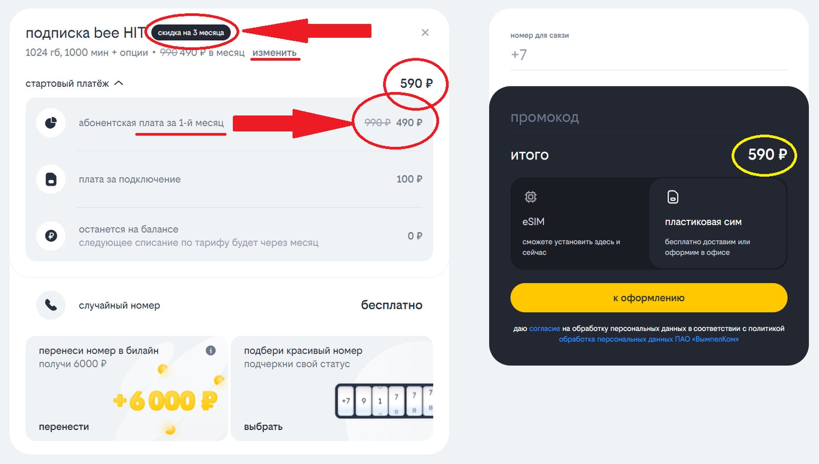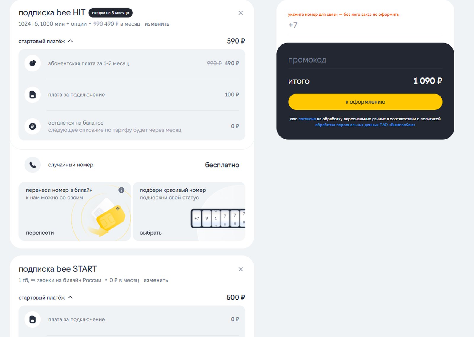 Дальше замечаешь, что 490 рублей — это плата за 1-й месяц, а потом (если приглядеться и рассмотреть бледно-серый шрифт) подписка bee HIT будет стоить уже 990 рублей. Однако при этом наверху висит плашка «скидка на 3 месяца». То есть 490 рублей — это на 3 месяца? Или 590 рублей — это в первый месяц, а потом ещё два месяца по 490 рублей или по 990 рублей по скидке?!