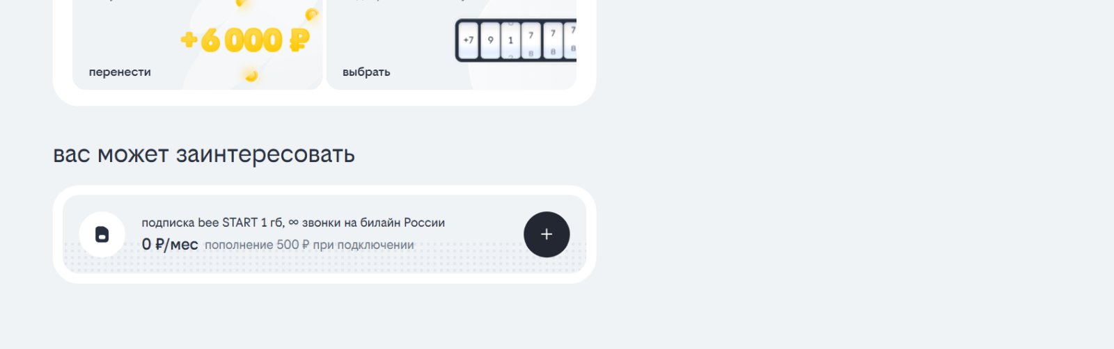 Ещё мне очень понравился низ этой веб-страницы. Там находится рубрика «Вас может заинтересовать» и предлагается подписка bee START за 0 рублей в месяц. Если нажать на значок «+», то просто ещё один тариф добавится в корзину, а итоговая цена вырастет на 500 рублей. Ну логично: к 490 рублям прибавить 0 рублей, и получится 1090 рублей. В принципе, все как в школе.
