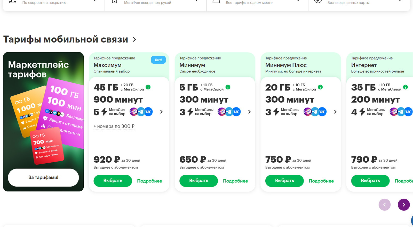 Начнем с базы. Маркетплейс тарифов находится в зоне с тарифами. Это не какая-то отдельная платформа, а просто страница в рамках сайта «МегаФона».
