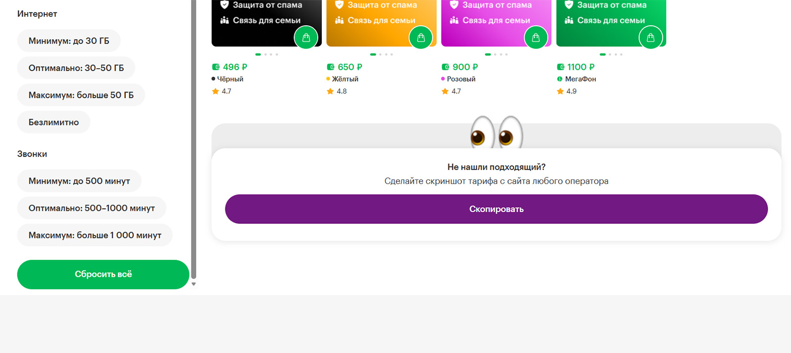 Внизу страницы висит предложение для тех, кто не нашел тариф для души. Таким предлагается сделать скриншот с сайта любого оператора, и тогда «МегаФон» скопирует тариф.