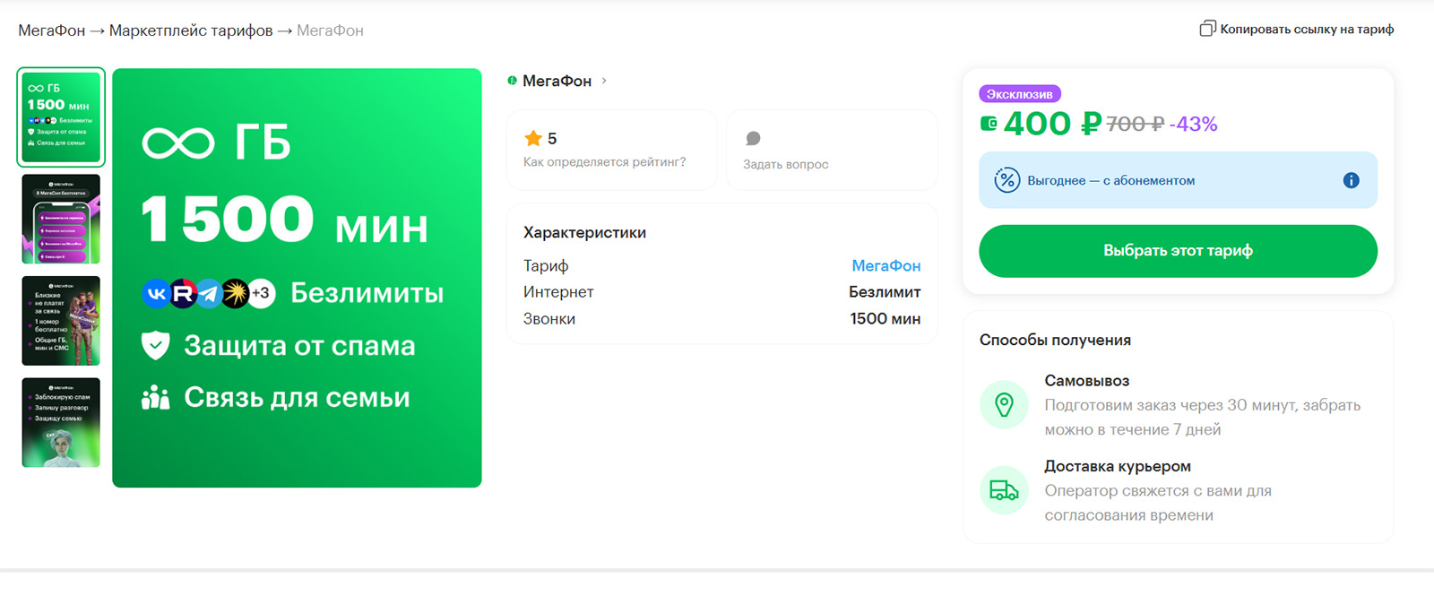 Если нажать на тариф, то откроется карточка товара. Там даже есть рейтинг! Я уж было подумал, что пользователи там отзывы оставляют, но нет. Рейтинг рассчитывает сам оператор на основе соотношения минут, ГБ, SMS и цены, а также частоты подключения на этом сайте.