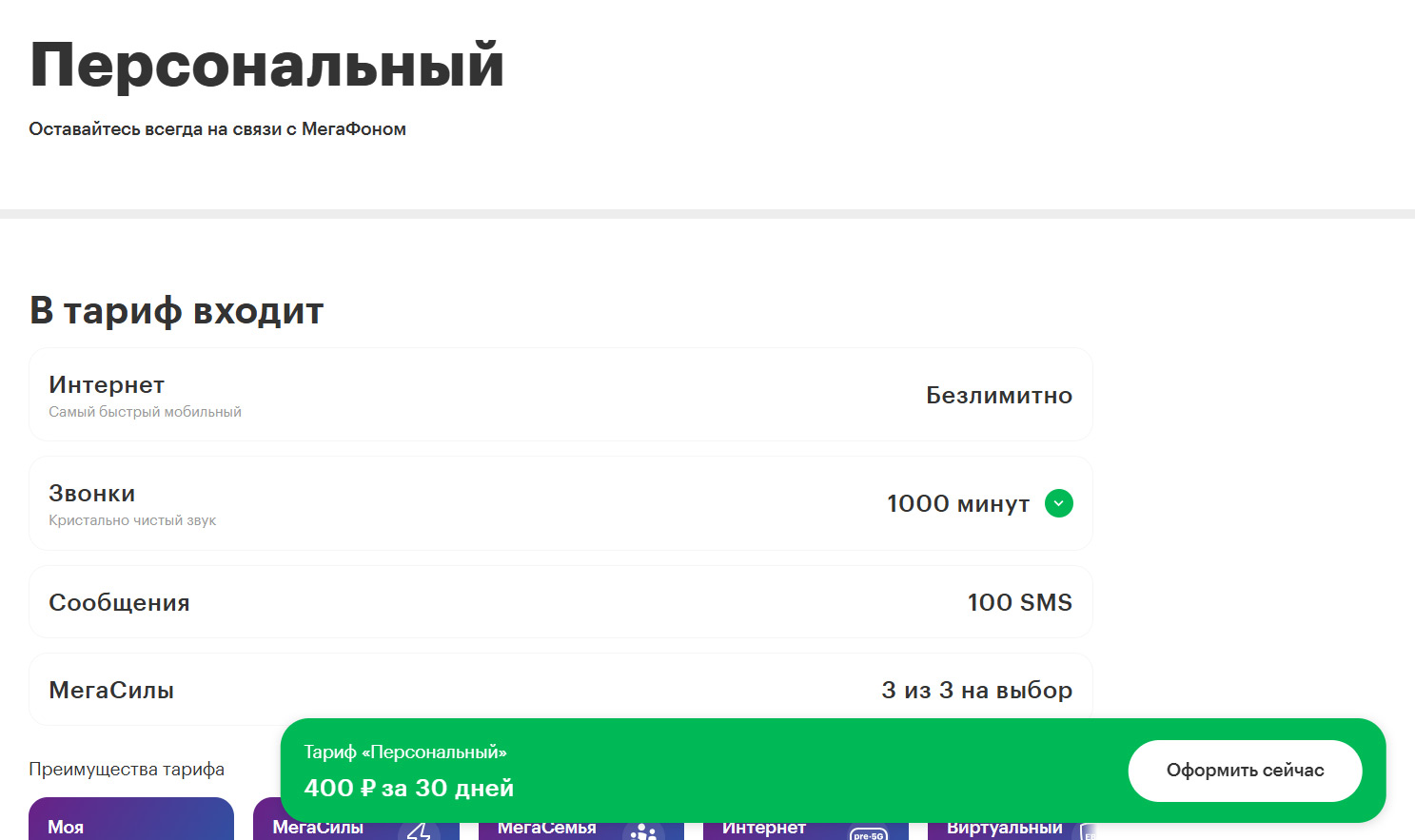 Надо признать, что многие тарифы выглядят очень привлекательно. Например, тут за 400 рублей в месяц оператор предлагает безлимитный интернет, 1000 минут на все номера России, безлимит внутри сети «МегаФона», 100 SMS, а также 3 «МегаСилы».