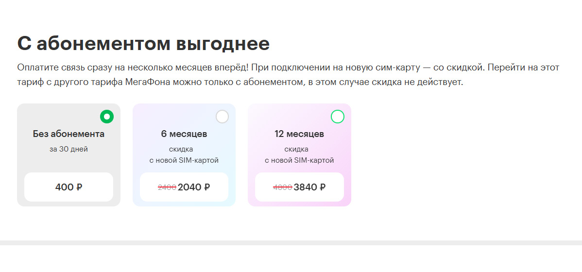 Новым пользователям рекомендую сразу приобретать абонемент на год. Раньше у «МегаФона» можно было купить и абонемент на 2 года, но теперь, видимо, оператор менее оптимистично смотрит в будущее. С абонементом предложение становится просто феноменальным: за 320 рублей в месяц дается безлимитный интернет, 1000 минут и 100 SMS.