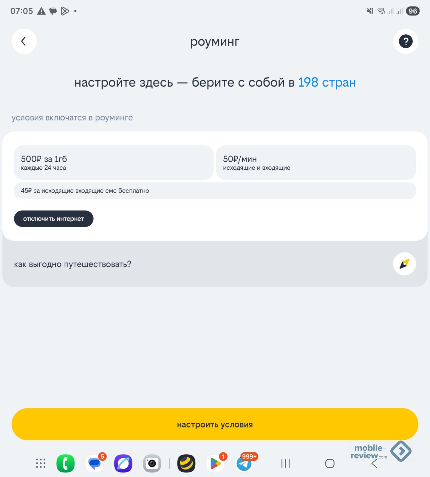Условия в лоб не самые дешевые, но вы получаете прозрачные цены, про которые можно спокойно помнить и не особо мудрить. Список стран, где действуют условия, можно узнать в приложении, на сайте их найти не удалось. Меня интересовали другие 25 стран, где стоимость 1 МБ составляет 800 рублей, что ставит крест на осознанном использовании интернета. Скорее тут важно все проверить, чтобы аппарат не вылезал туда сам.