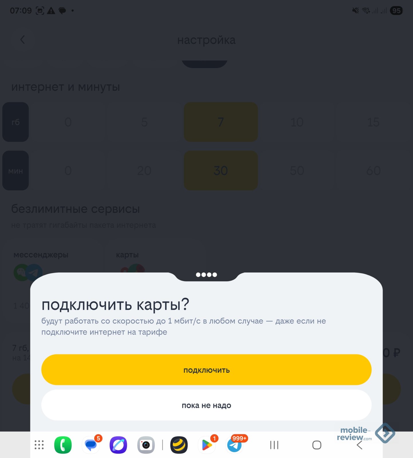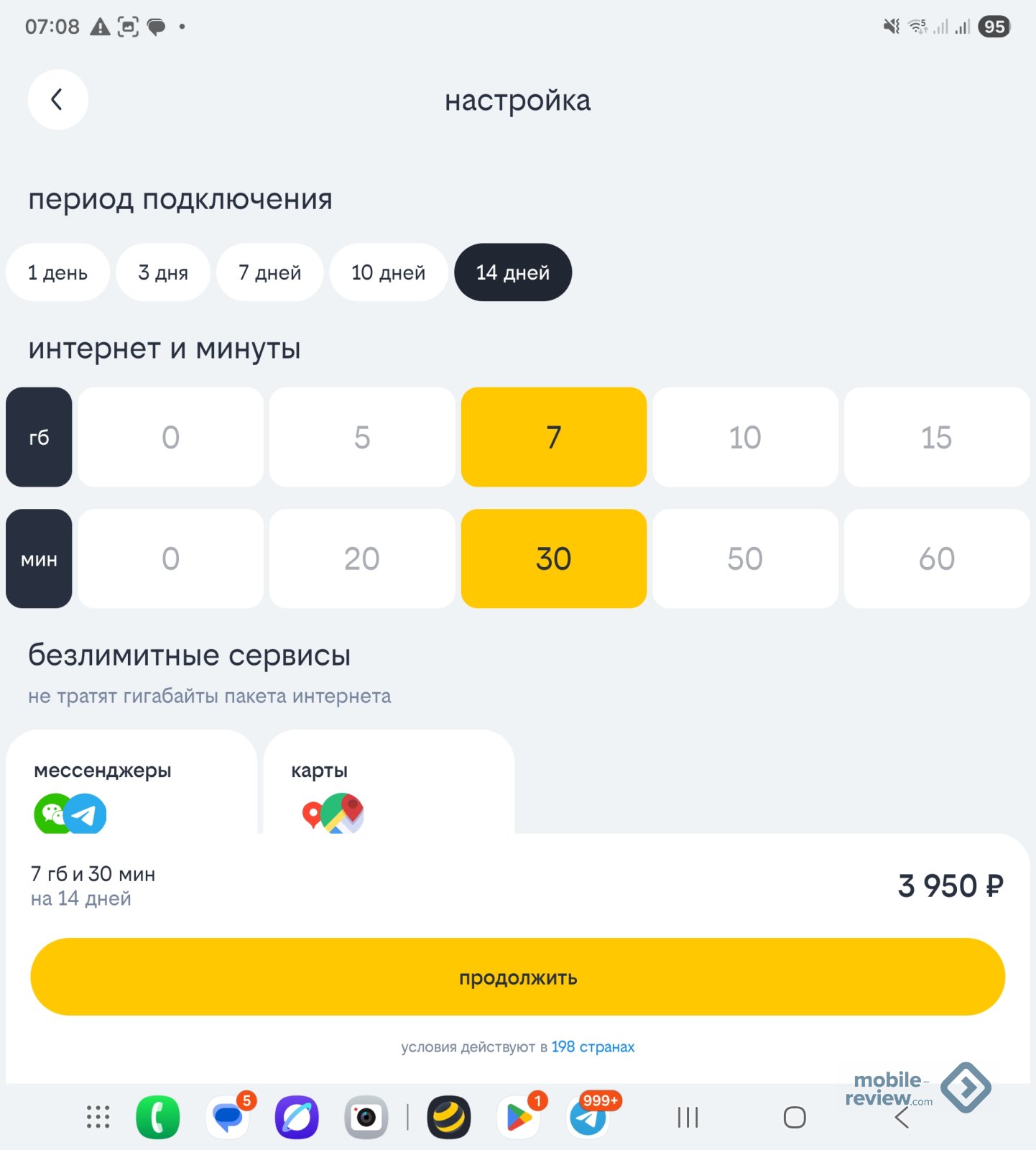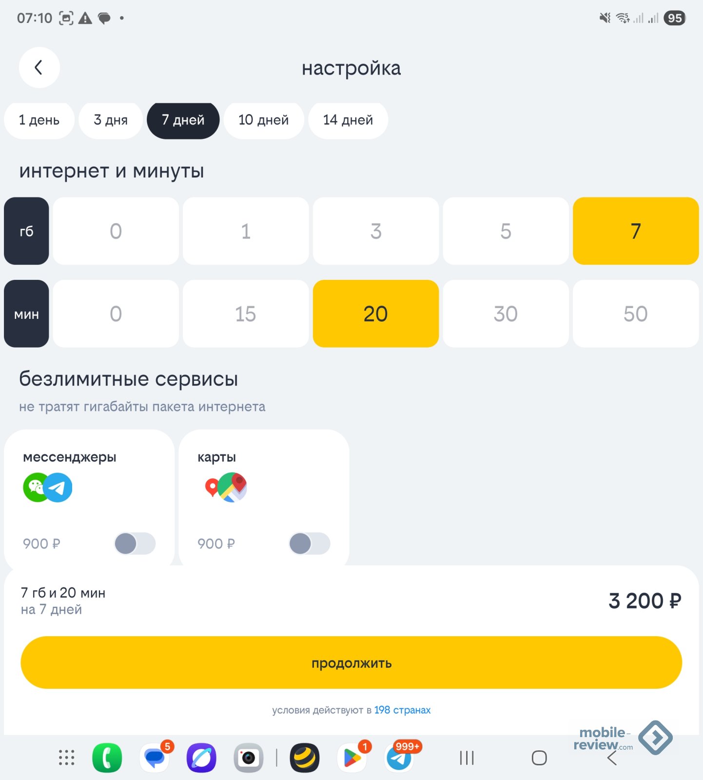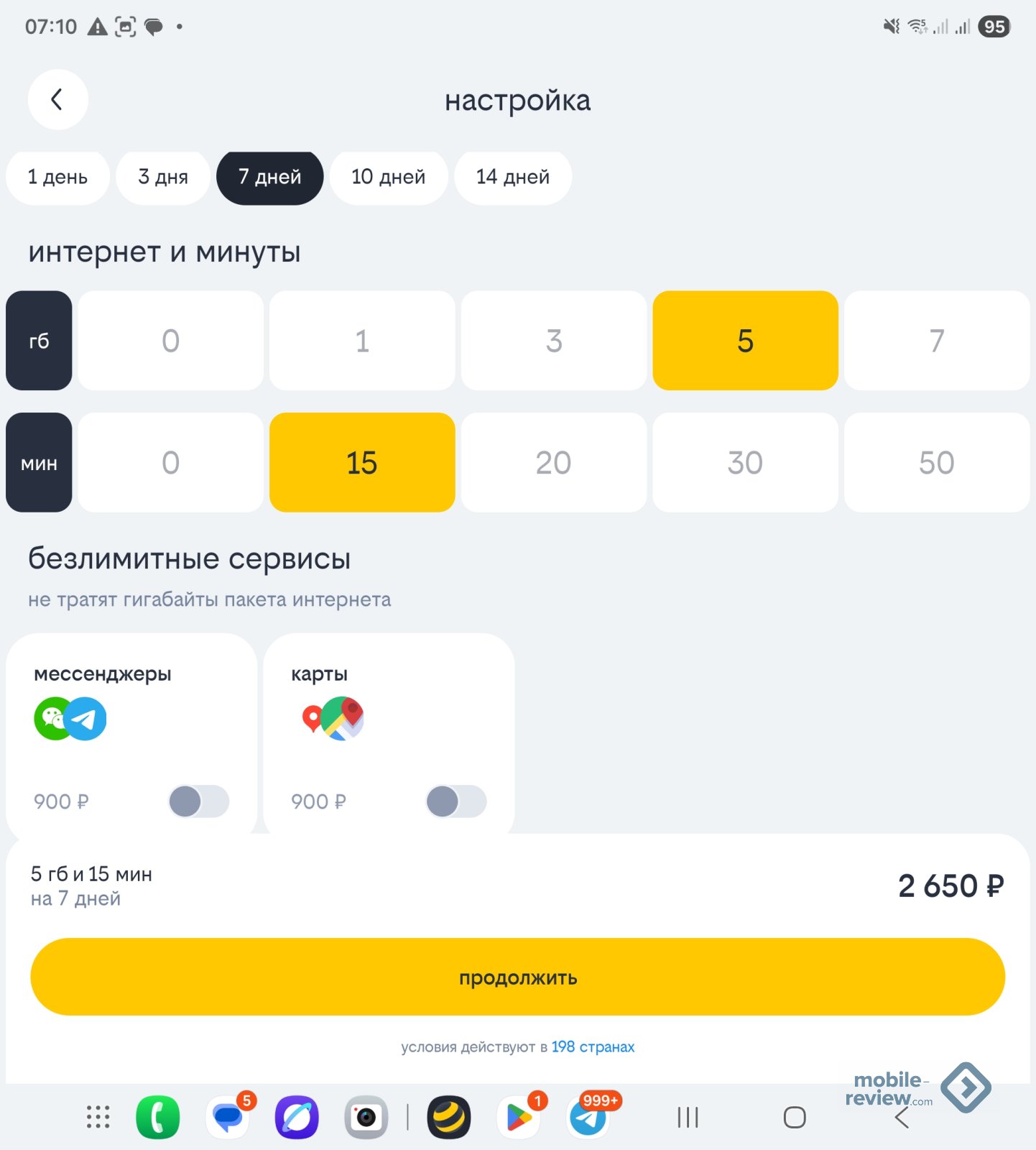 Можно включить и дополнительные опции, например, мессенджеры в роуминге. Тут нужно четко понимать, что ваш телефон при включенном мобильном интернете будет загружать прогноз погоды, возможно, какие-то другие сервисы, и помимо мессенджеров вы потратите трафик, который будете оплачивать по расценкам почти в 8 рублей за 100 КБ. Получится явно дороже, чем вы рассчитывали.