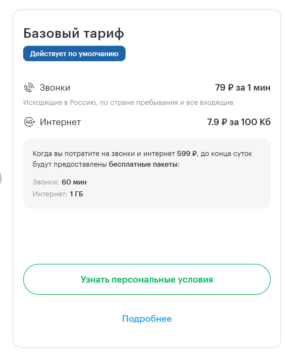 Изыски маркетинга бывают не всегда понятны обычному человеку. Кажется, в «МегаФоне» решали задачу, как представить пакеты на роуминг так, чтобы они не выглядели как у других операторов, но по сути оставались такими же. По умолчанию для всех номеров действует базовый тариф, в нем минута звонка стоит 79 рублей, а 100 КБ интернета обойдутся вам в 7.9 рубля. Тяжело посчитать и понять, как много вы израсходуете трафика.