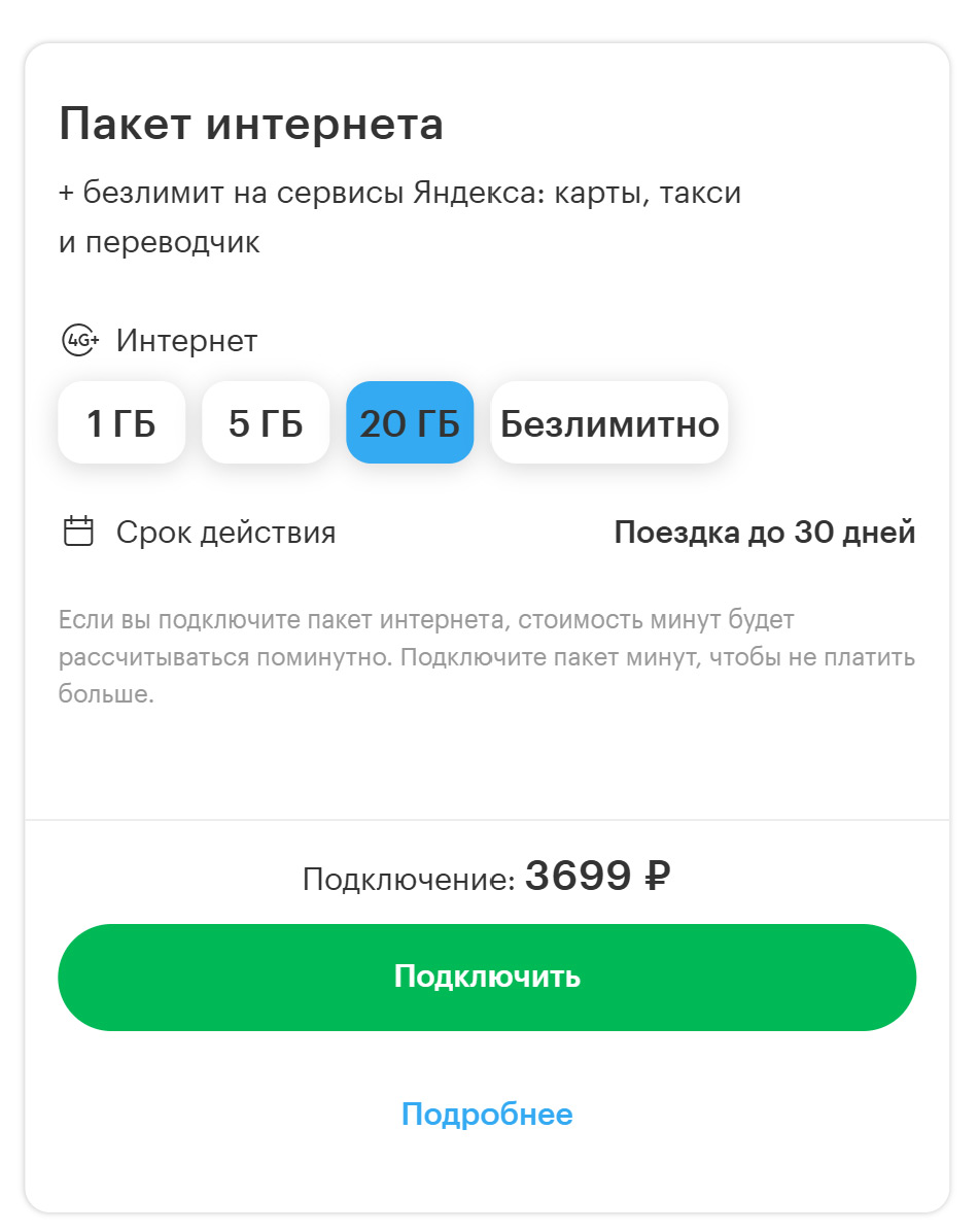 Для тех, кто не хочет платить за обычный пакет, есть дополнительная опция, конструктор под вашу поездку, в нем можно выбрать период подключения (от 1 до 14 дней), нужный пакет минут и ГБ, а также опции безлимитных сервисов (мессенджеры и карты). Опции дорогие, стоят 1400 рублей в пакете на две недели, при этом по умолчанию вам дают 1 Мб/с для тех же карт, так что этого должно хватить для простой навигации.