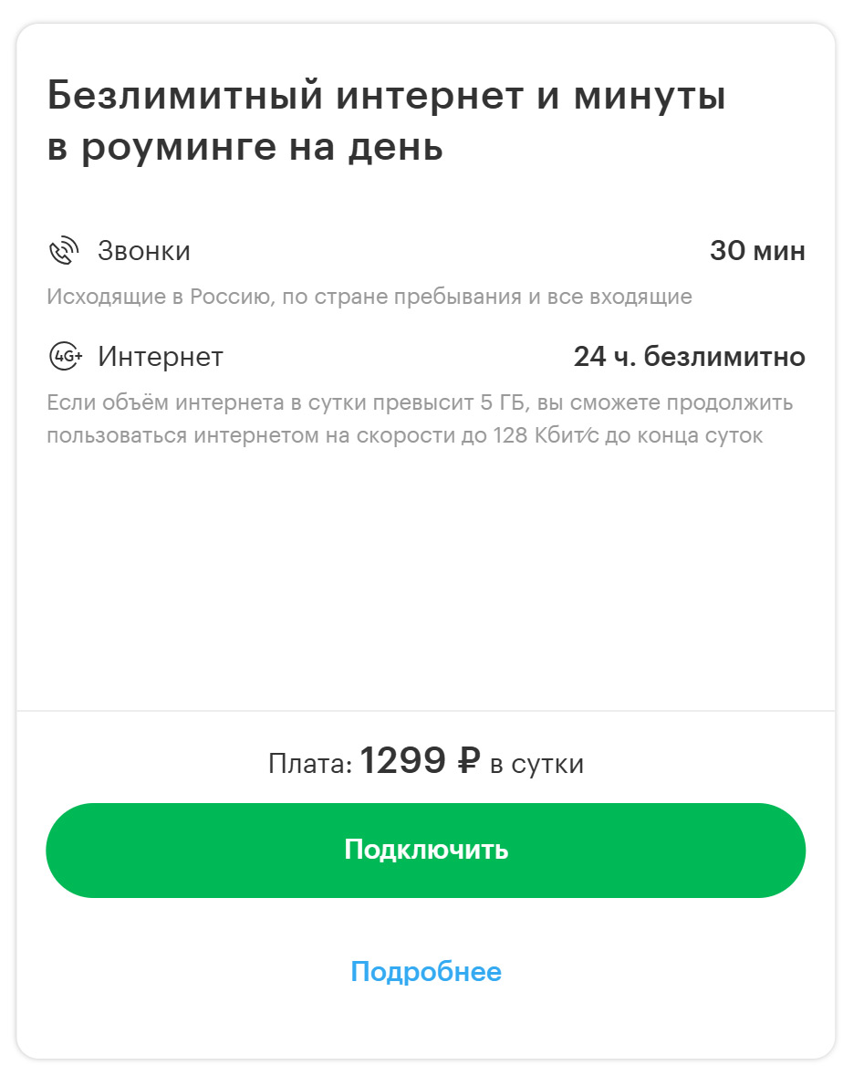 За 1299 рублей можно включить «безлимитный» интернет на 24 часа, вам дадут 5 ГБ трафика и 60 минут звонков (всех типов). Дорогое предложение.